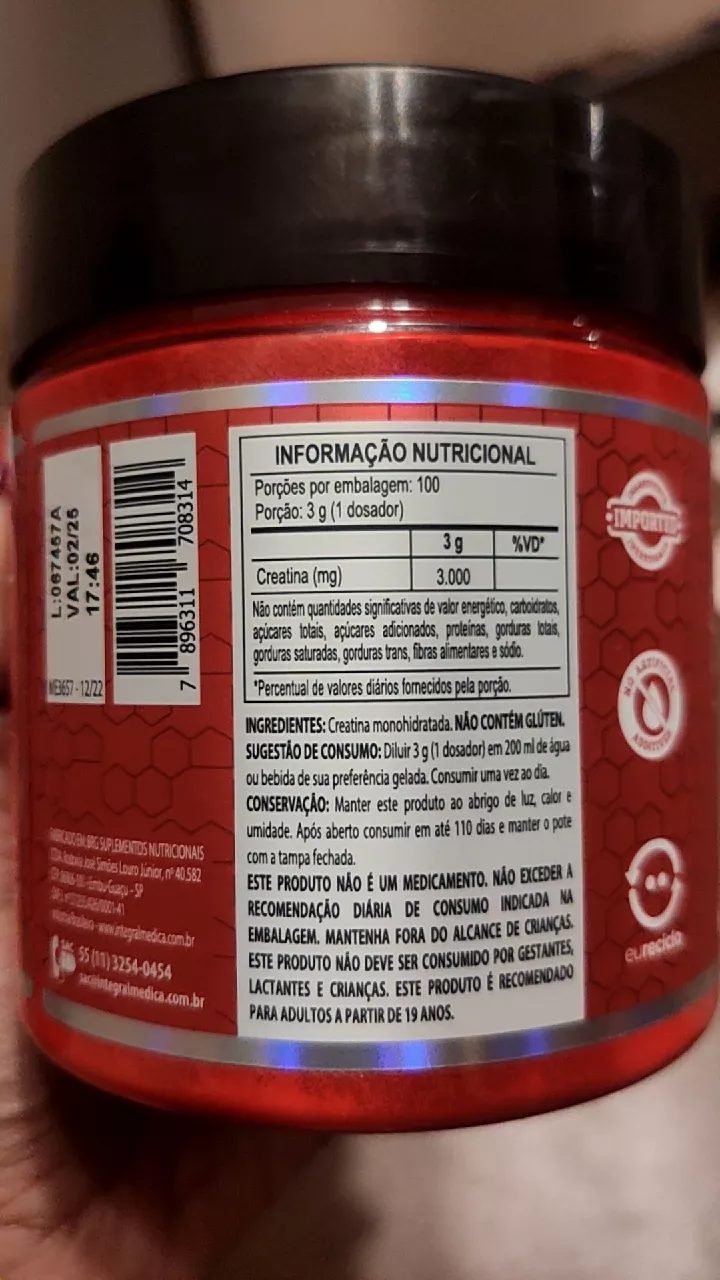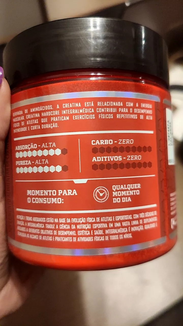 A Creatina Hardcore Powder da Integral medica fornece 3g de Creatina Monohidratada pura por porção Esta apresentação não possui sabor ou odor e misturase instantaneamente em água ou sua bebida favorita Creatina é um produto destinado a completar os estoques endógenos de Creatina Suplemento Creatina para Atletas em pó