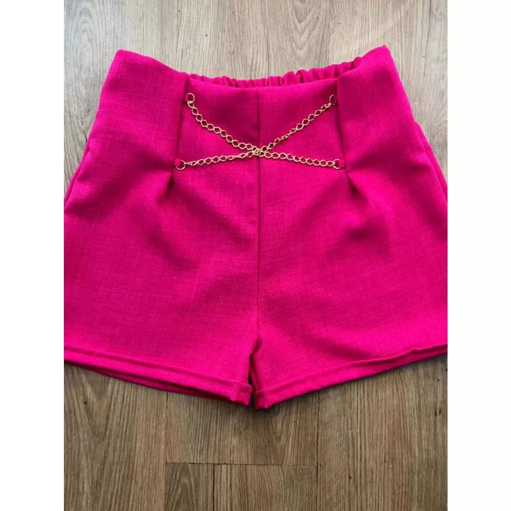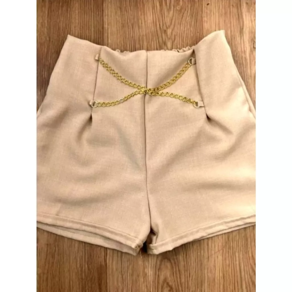 SHORTS FEMININO ALFAIATARIA CINTURA ALTA COM DETALHE DE CORRENTE EM X E ELÁSTICO NO CÓS NA PARTE DE TRÁS PERMITINDO COM QUE O SHORTS NÃO FIQUE APERTADO