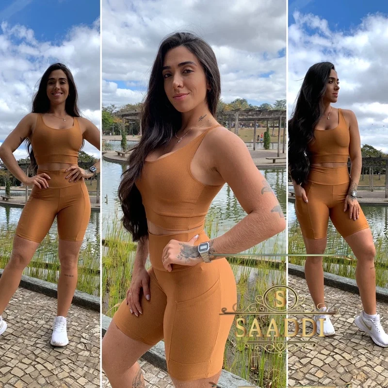 lindo conjunto fitnessbermuda com bolso e topertecido poliamida microcanelado com brilhocom proteção uv 50