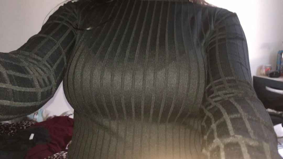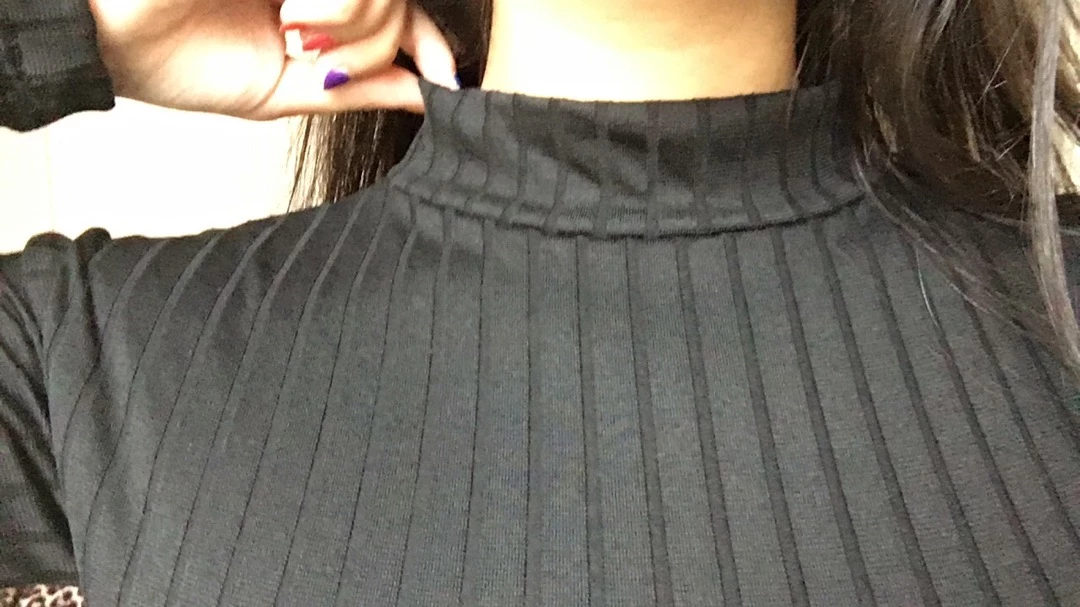 A blusa possui gola alta, mangas longas compridas e é feita em tecido canelado.