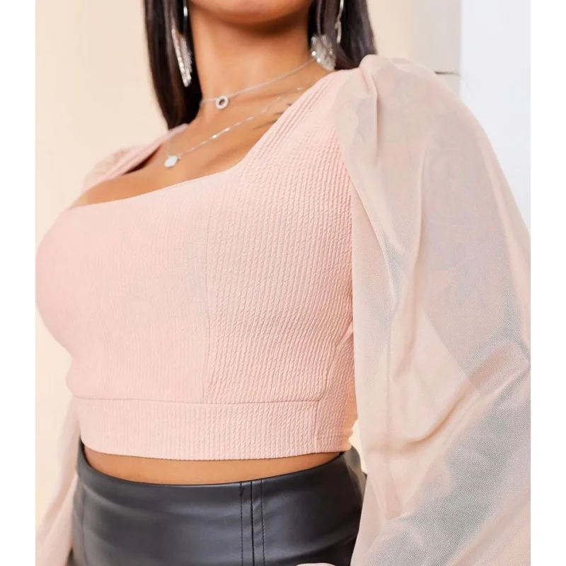 Blusa Feminina de Inverno Elegante Casual em Tule Manga Grosso Ana Ruga - Nude