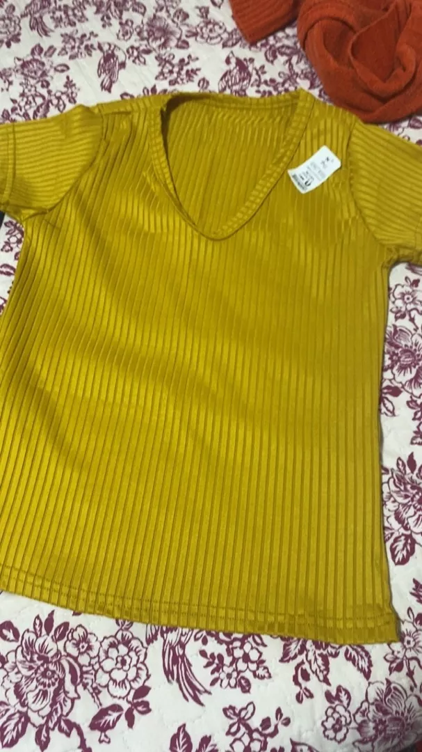 Blusa Feminina Manga Curta Gola V Canelada - Promoção - mostarda