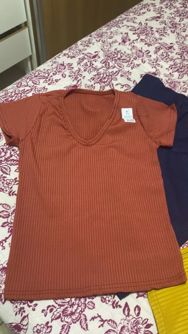 Compre a Blusa Blusinha Feminina Canelada Gola V Manga Curta Blogueira na loja online Raryel. Aproveite os preços baixos e promoções!