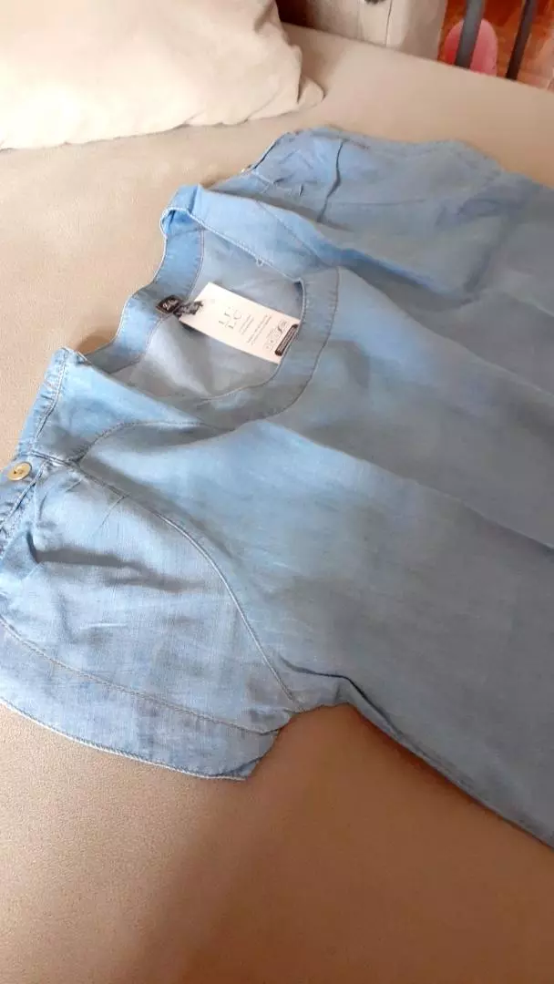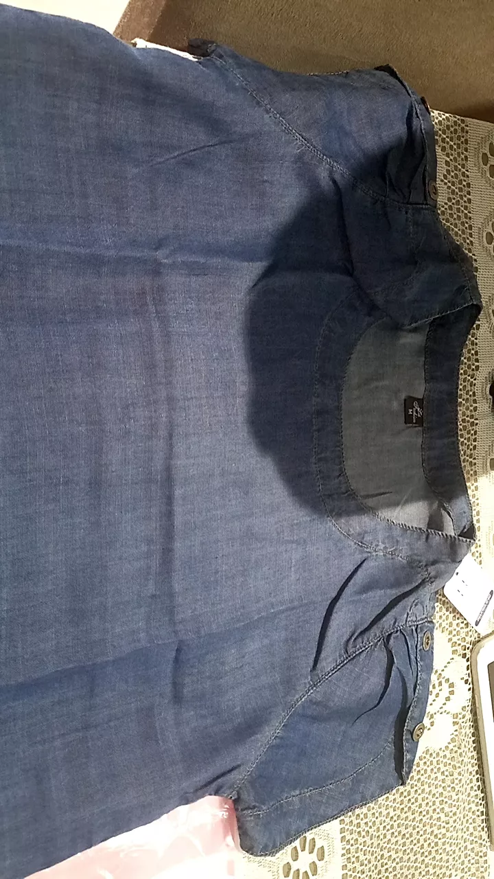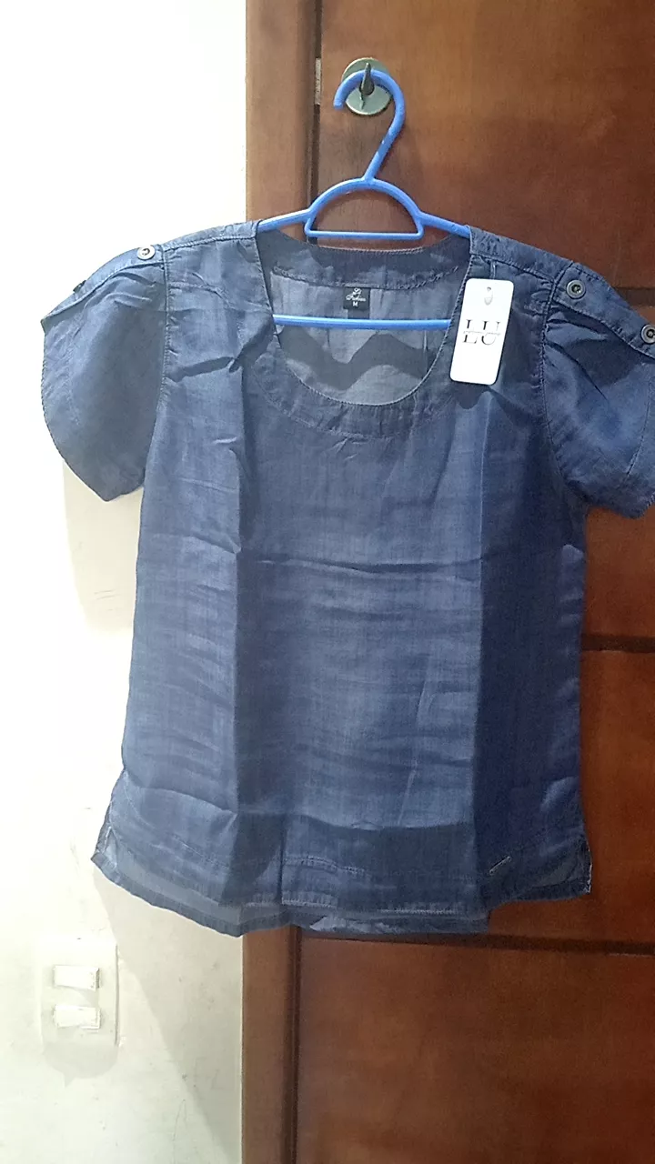 Compre a blusa feminina jeans manga curta com gola canoa e dois botões na loja online Raryel. Aproveite nossos preços baixos e descontos!