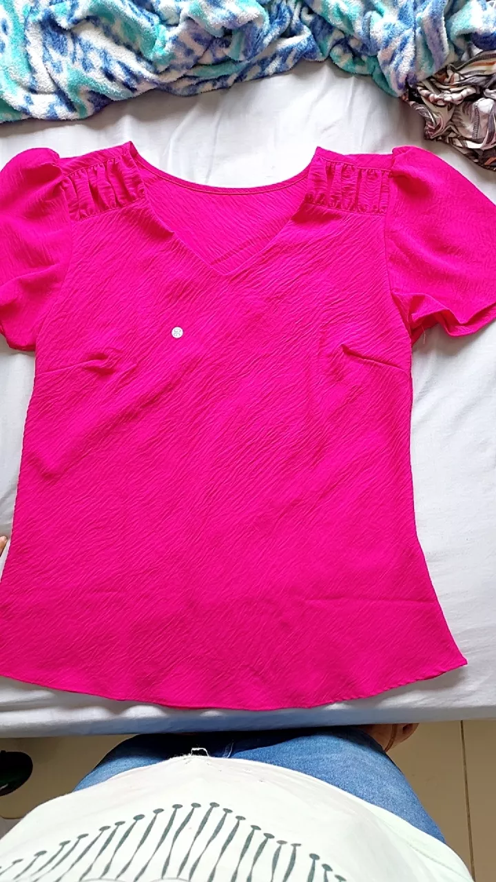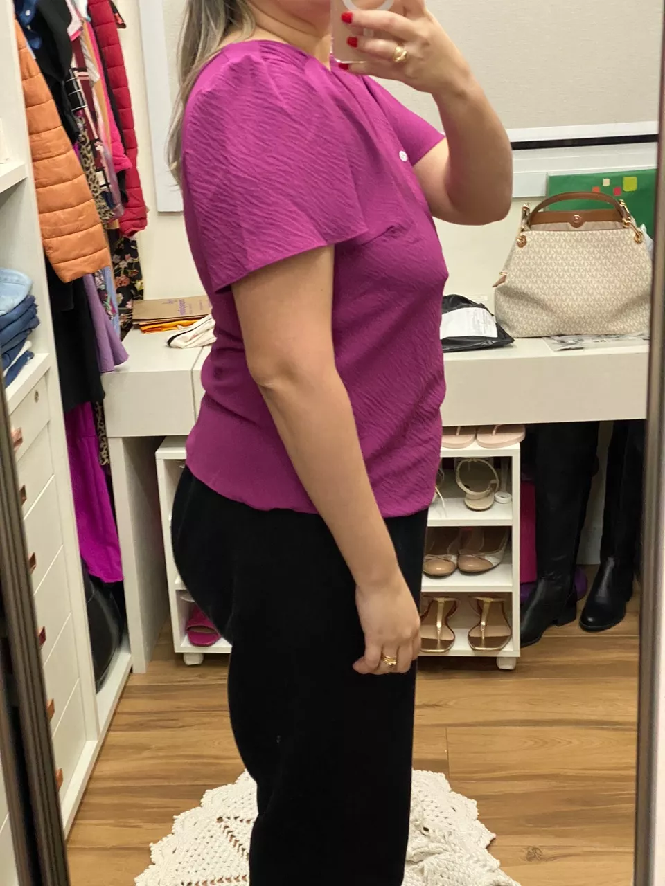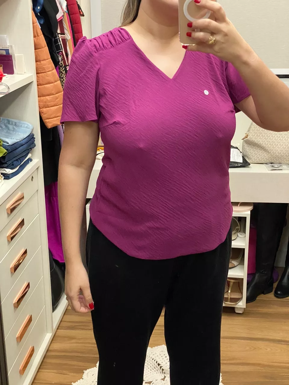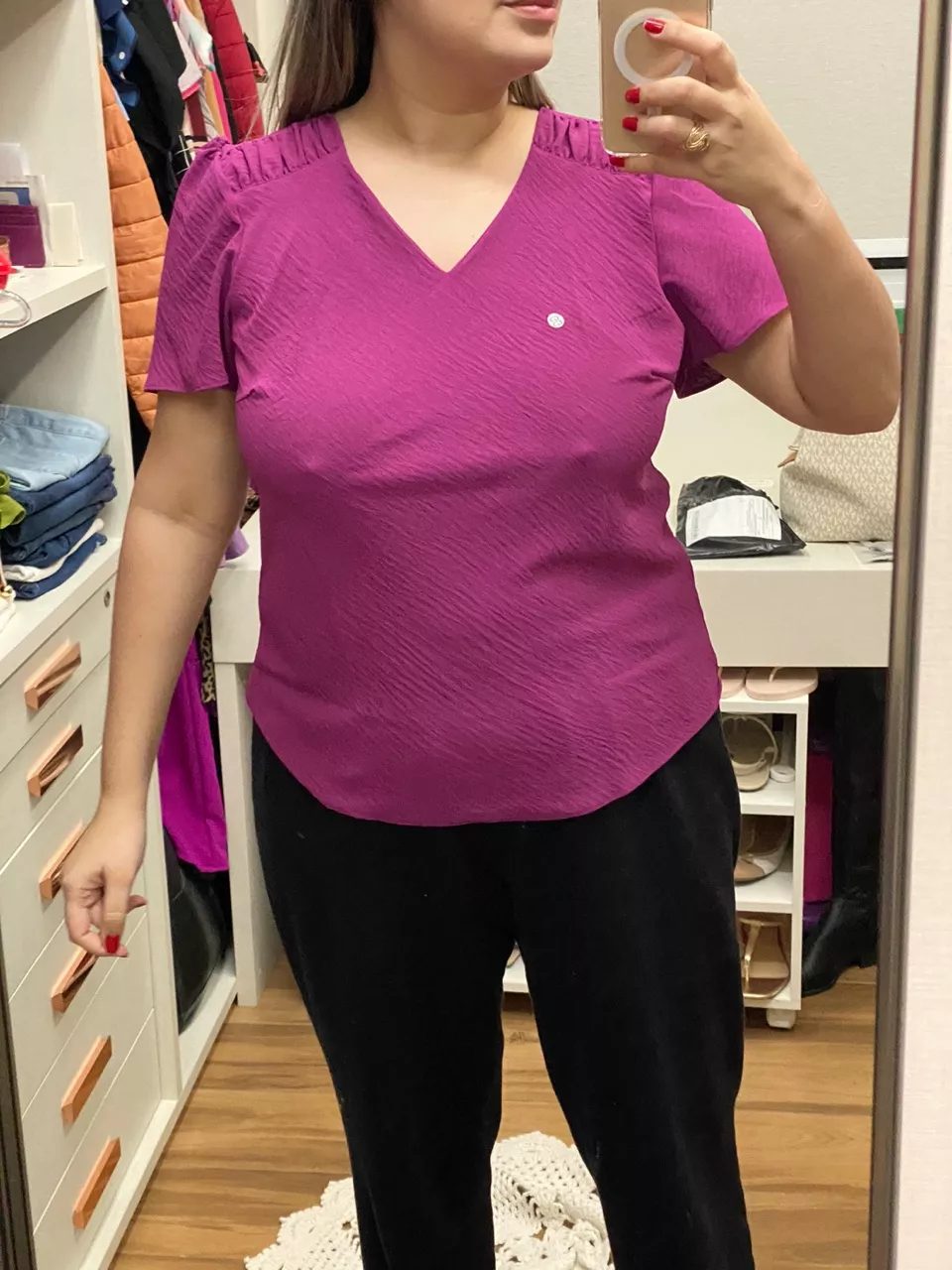 Compre a blusa feminina manga curta com detalhe em elástico no ombro na loja online Raryel. Aproveite nossos preços baixos e promoções!