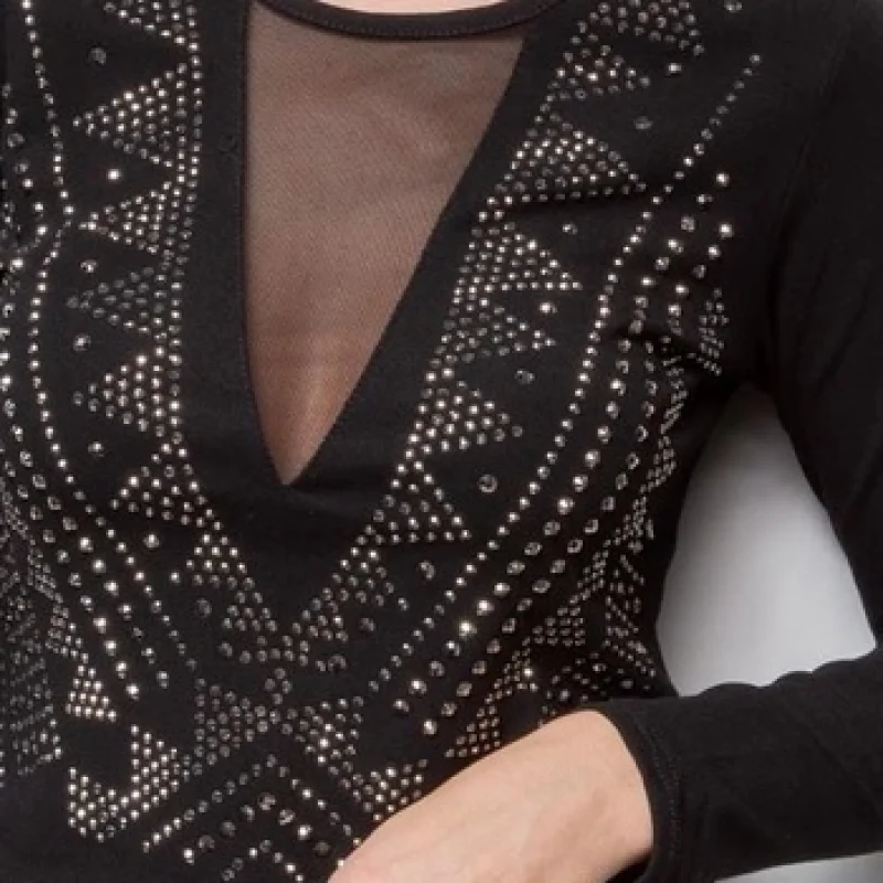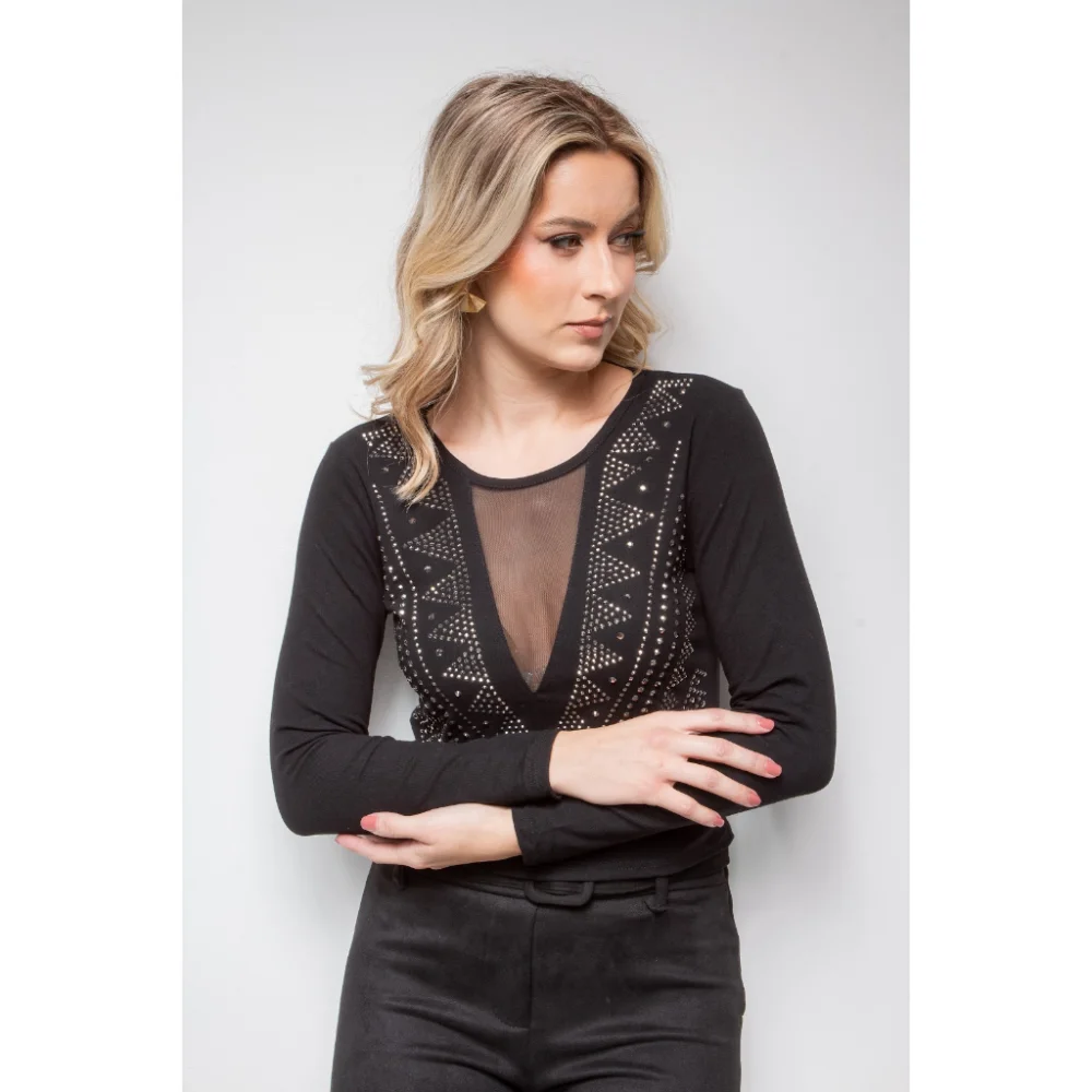 Blusa Tule Manga Longa com Detalhes em Strass - Preto
