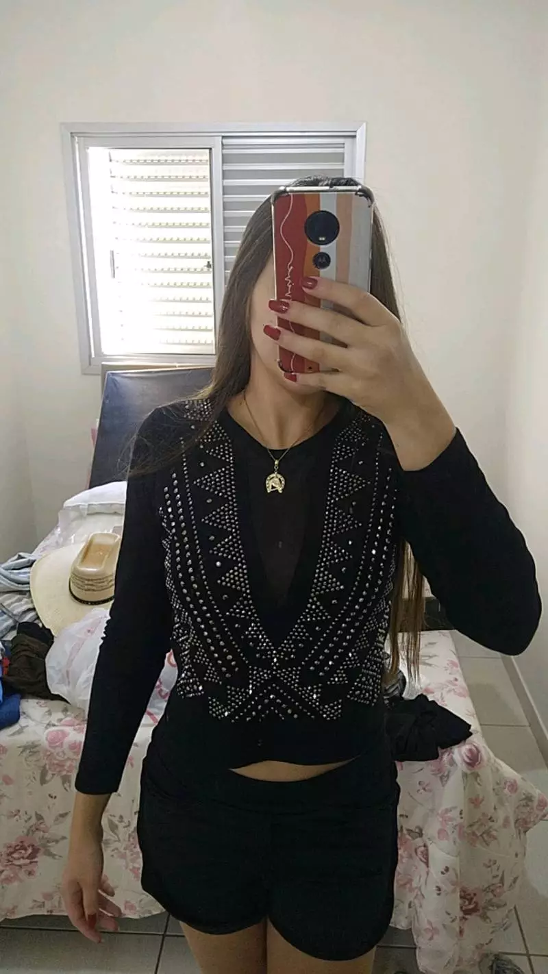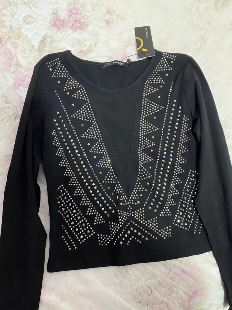 Blusa manga longa possui decote em V trabalhada em hotfix pedraria com tule no decote em V