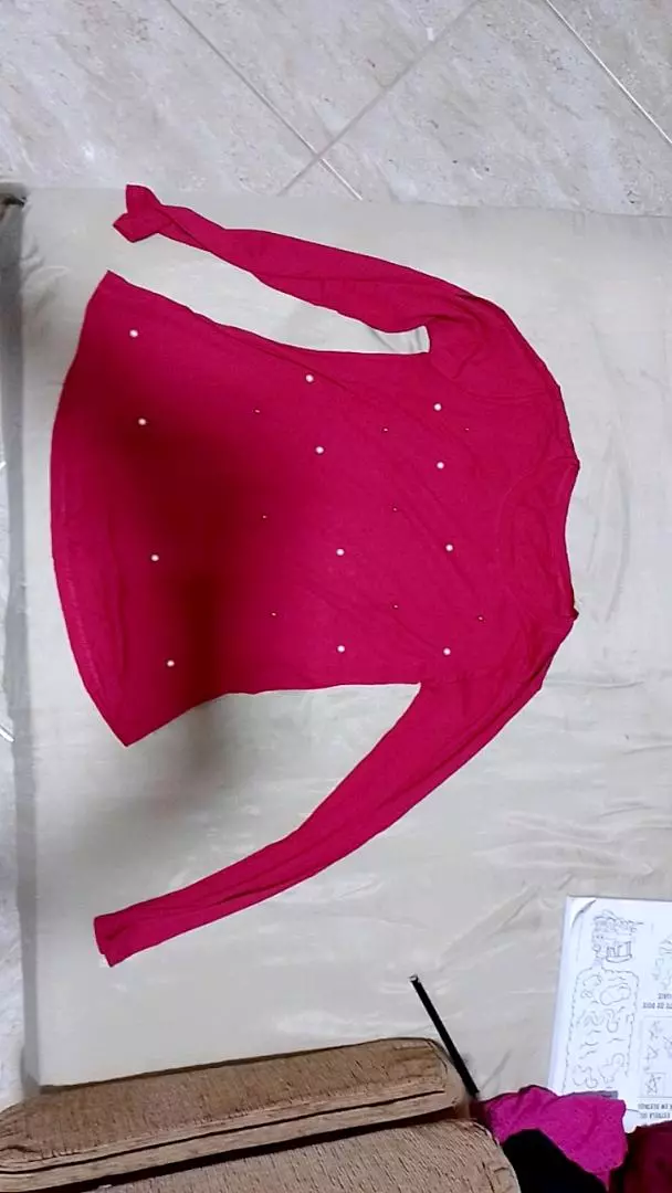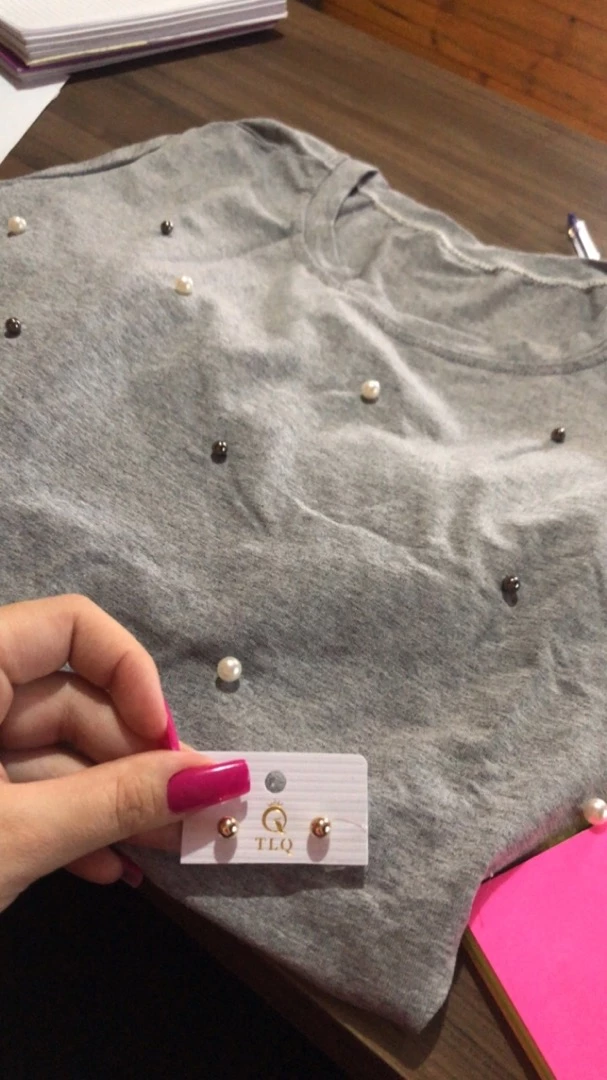 Possui decote redondo manga longa com aplicação de pérolas sintéticas acabamento e costura no tom