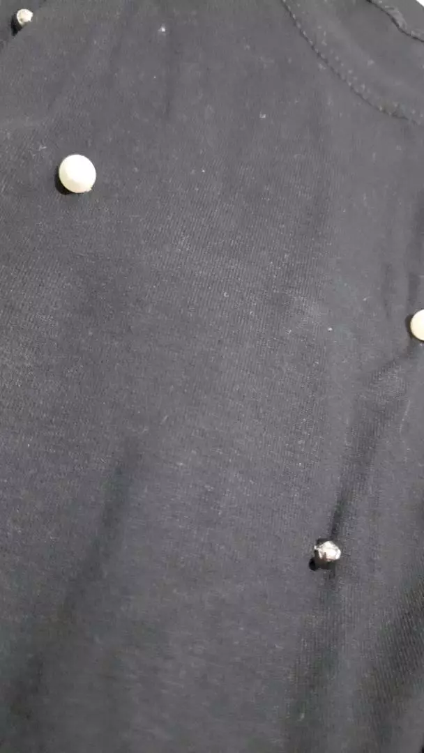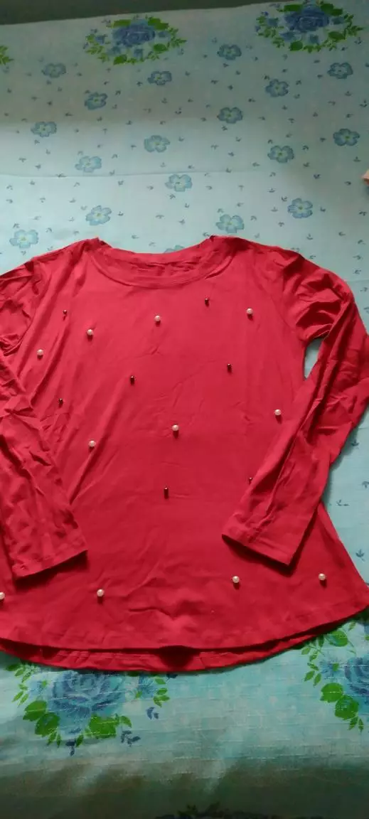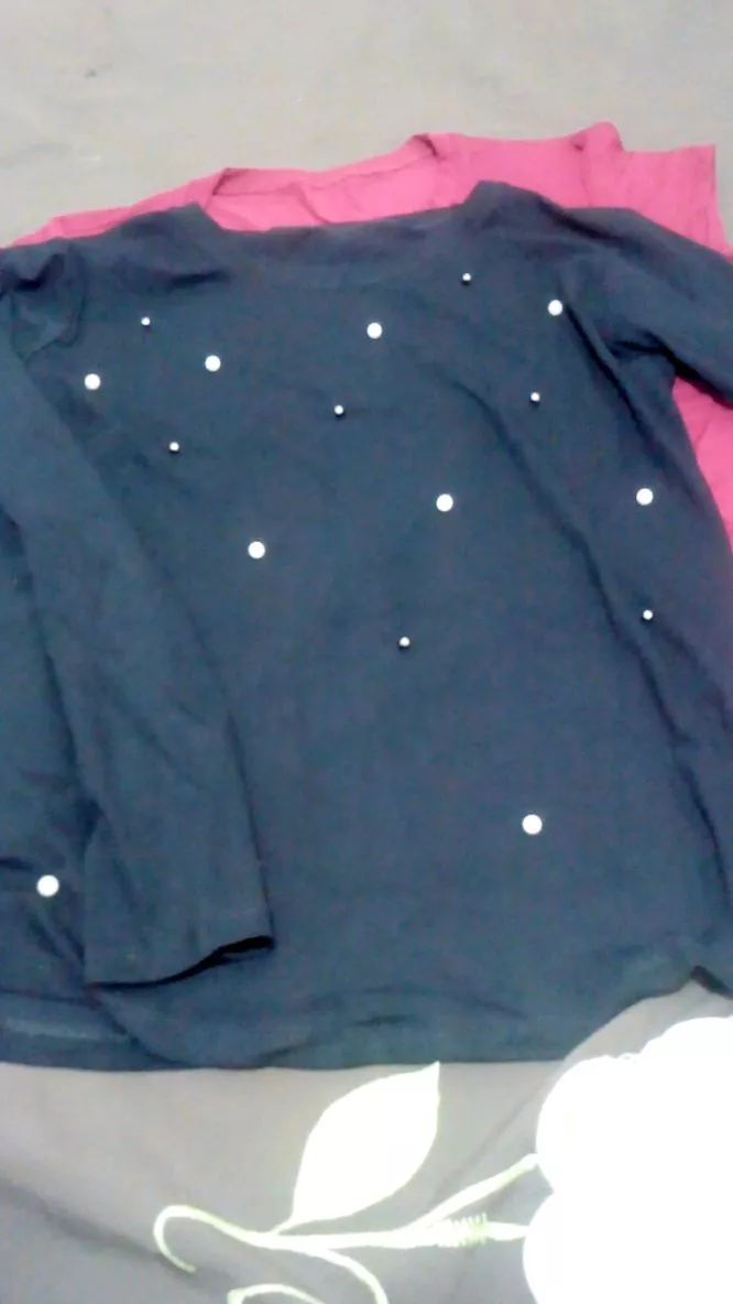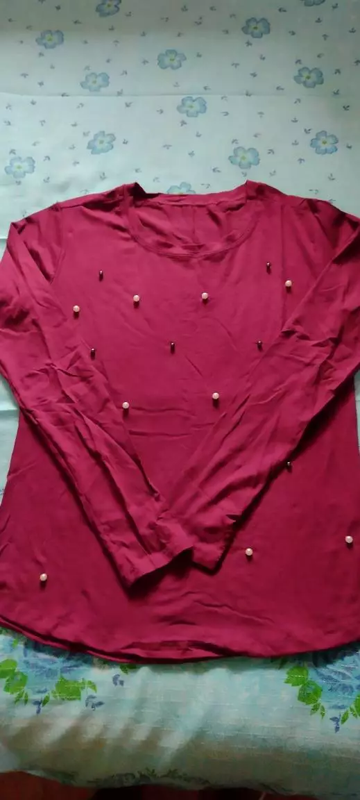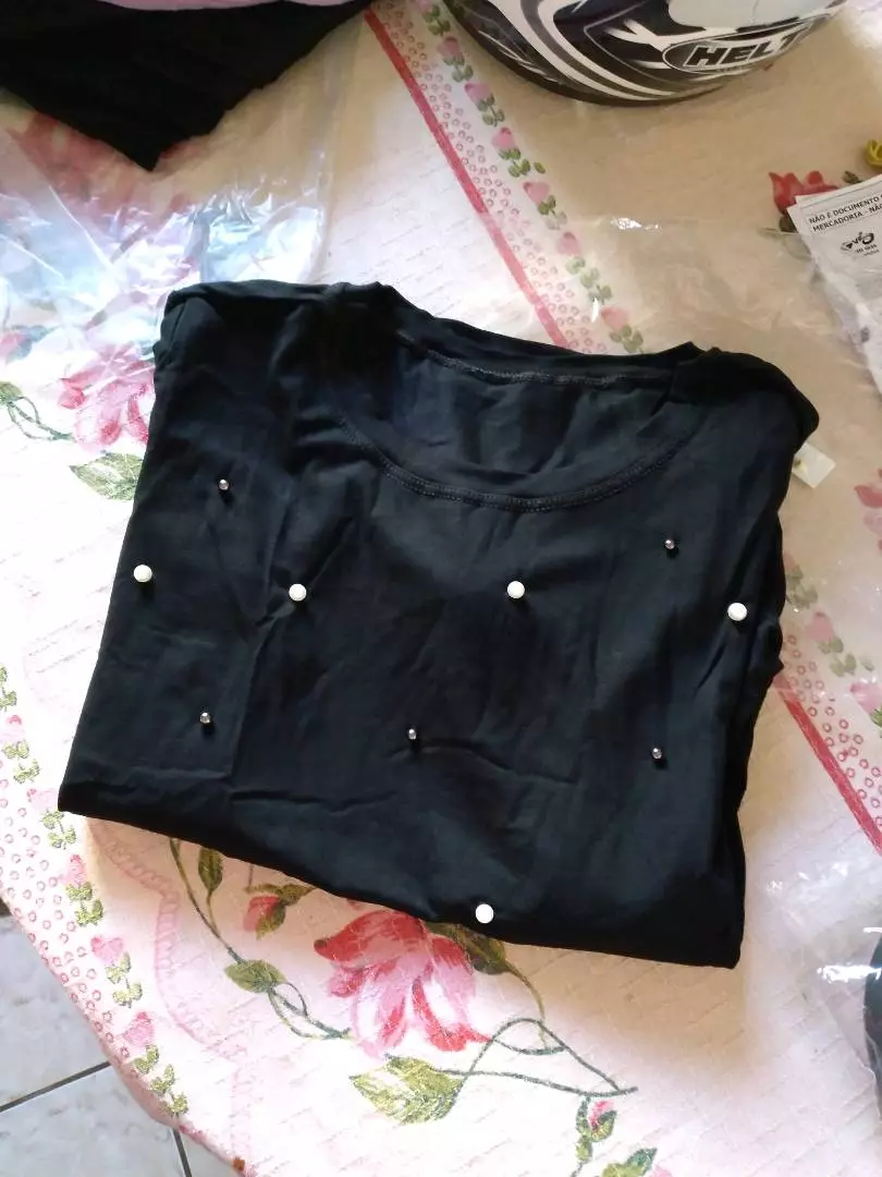 Possui decote redondo manga longa com aplicação de pérolas sintéticas acabamento e costura no tom
