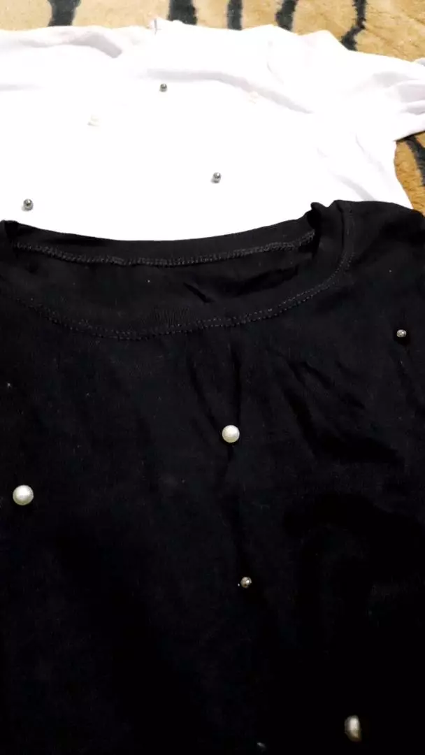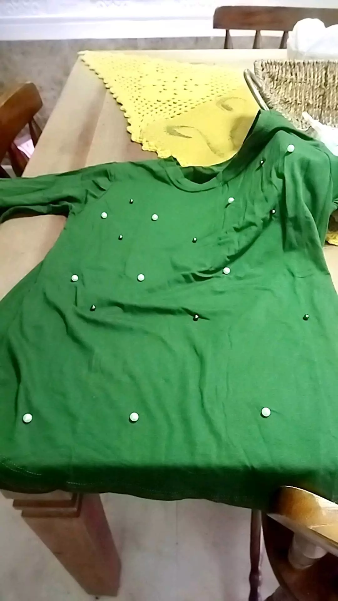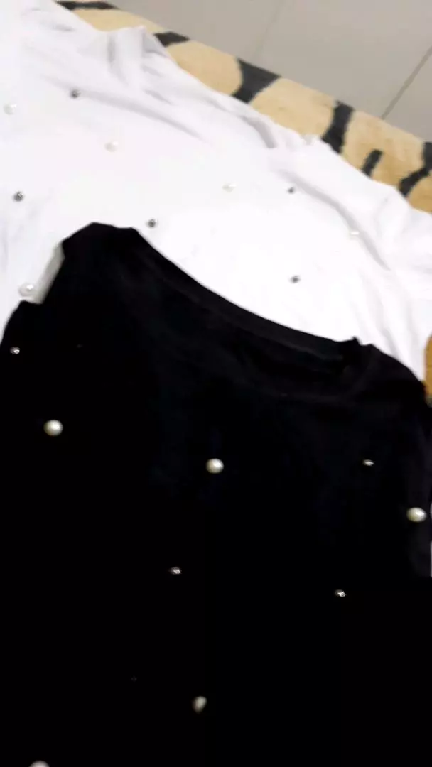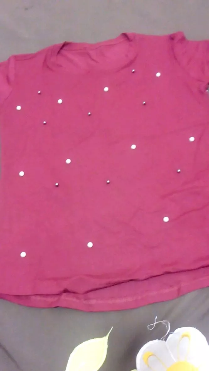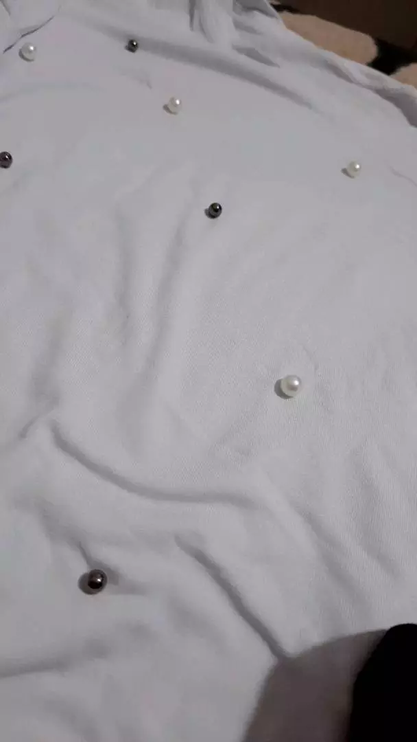 Possui decote redondo manga longa com aplicação de pérolas sintéticas acabamento e costura no tom