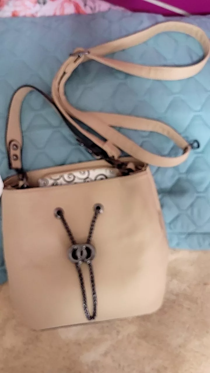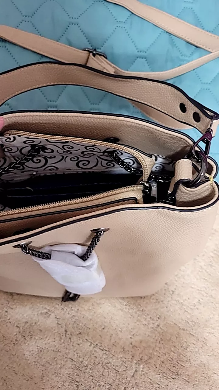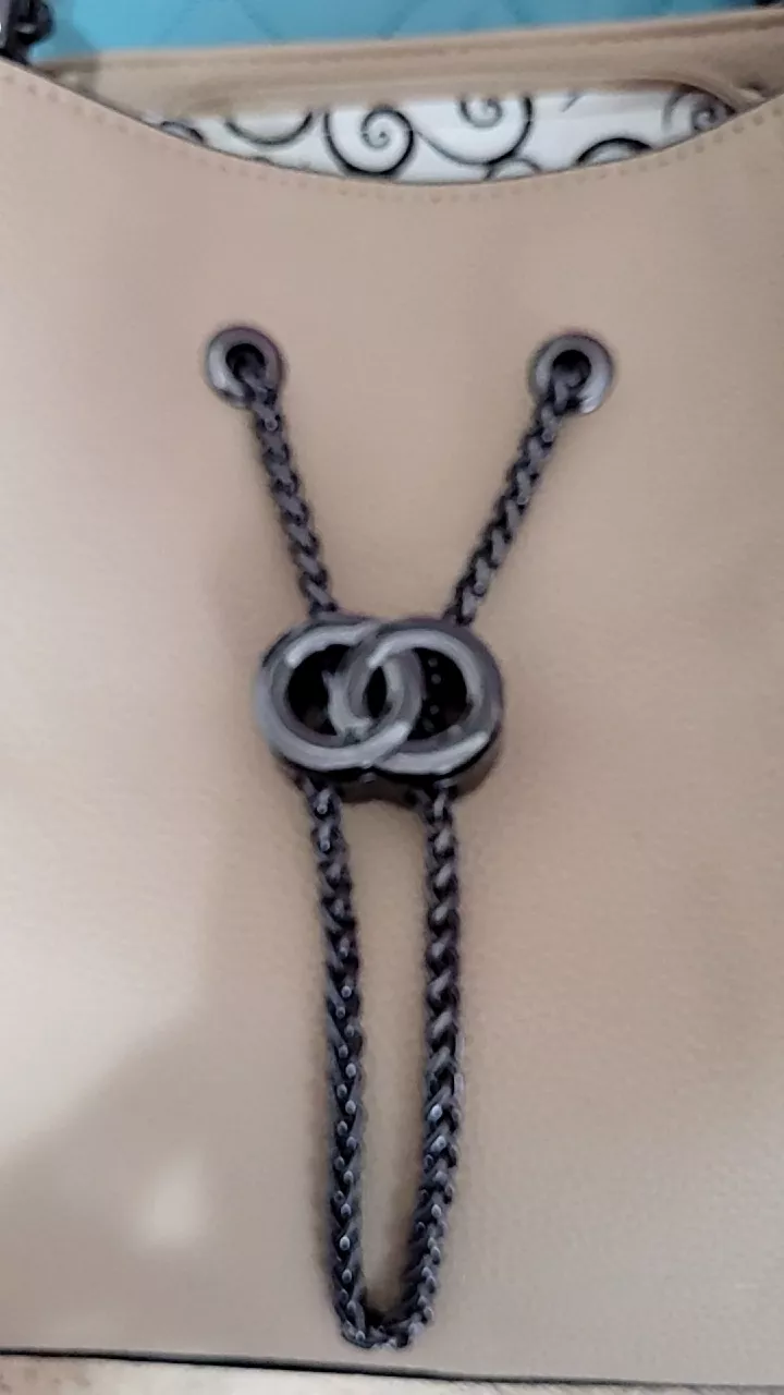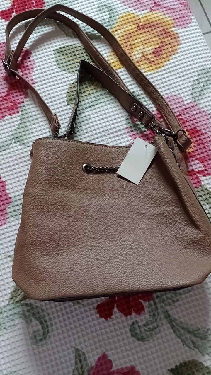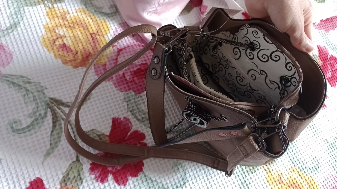 Bolsa de material couro sintético com duas alças forrada fecho de zíper e corrente de ajuste Estilo saco