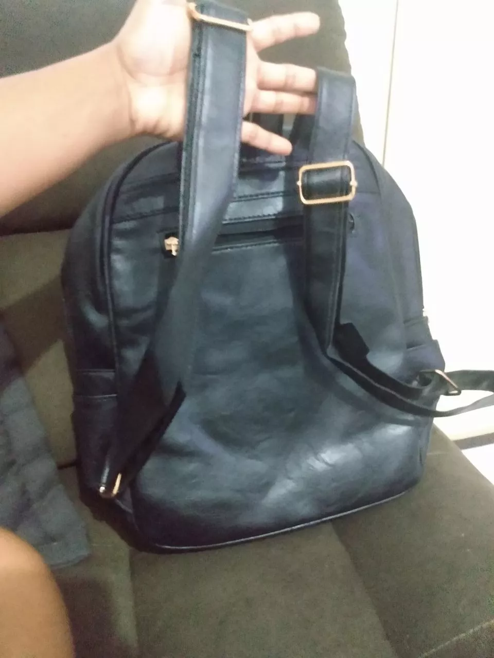 Mochila feminina de couro com 34 cm de altura 30 cm de largura e 14 cm de profundidade Pesa cerca de 650 g Possui uma alça pequena para mão e duas alças reforçadas com regulagem de tamanho para as costas A parte externa conta com 2 bolsos de zíper na frente e dois bolsos para garrafas nas laterais Além disso a Mochila Feminina possui um grandes compartimentos com zíper Uma Mochila de couro reforçada ideal para carregar tudo o que for preciso para o dia a dia seja faculdade trabalho ou lazer