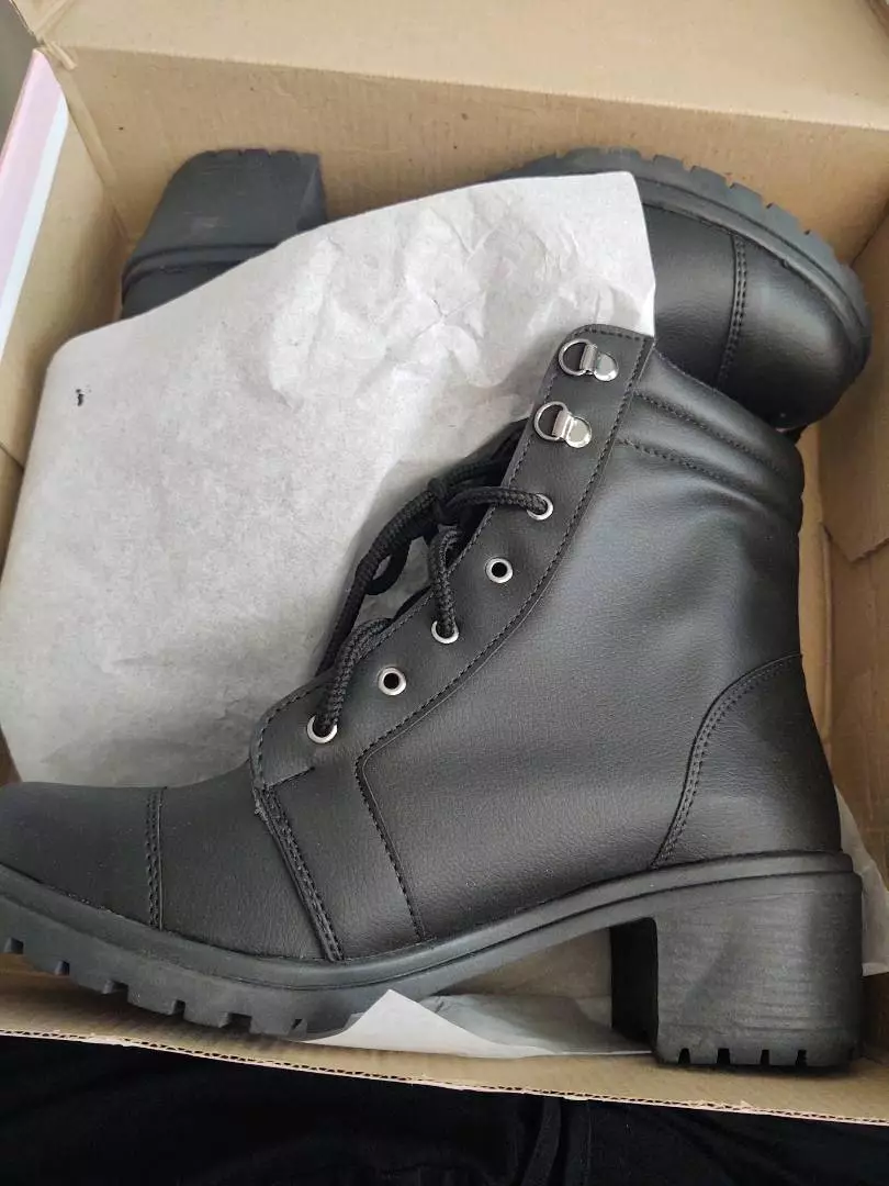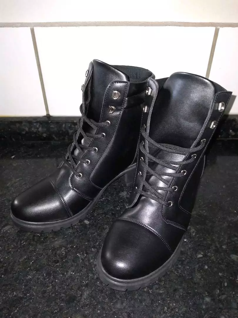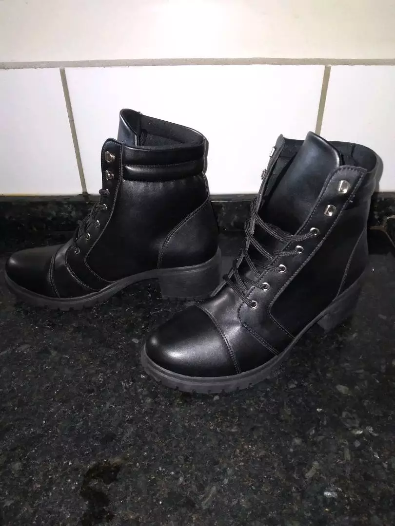 Coturno cabedal preto e café sintético ajuste em cadarço preto com ilhós ferradura detalhe em costura lateral e traseiro forro super macio e confortável palmilha interna na cor preto salto botinha 5cm e cano 13 cm