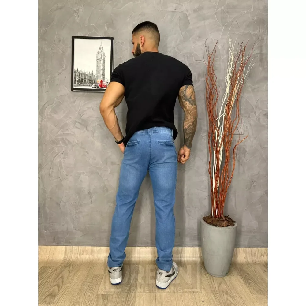 Calça Esporte Fino Masculina em Jeans O modelo que conquistou milhares por sua versatilidade e caimento agora feita também em Jeans para acrescentar ainda mais charme e exclusividade ao seu guarda roupa
