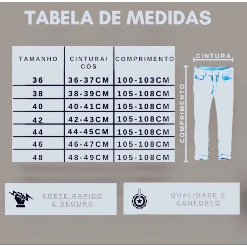 R Nossas calças tem o tamanho normal recomendamos escolher o seu número e SEMPRE olhar a tabela de medidas caso tenha alguma dúvida