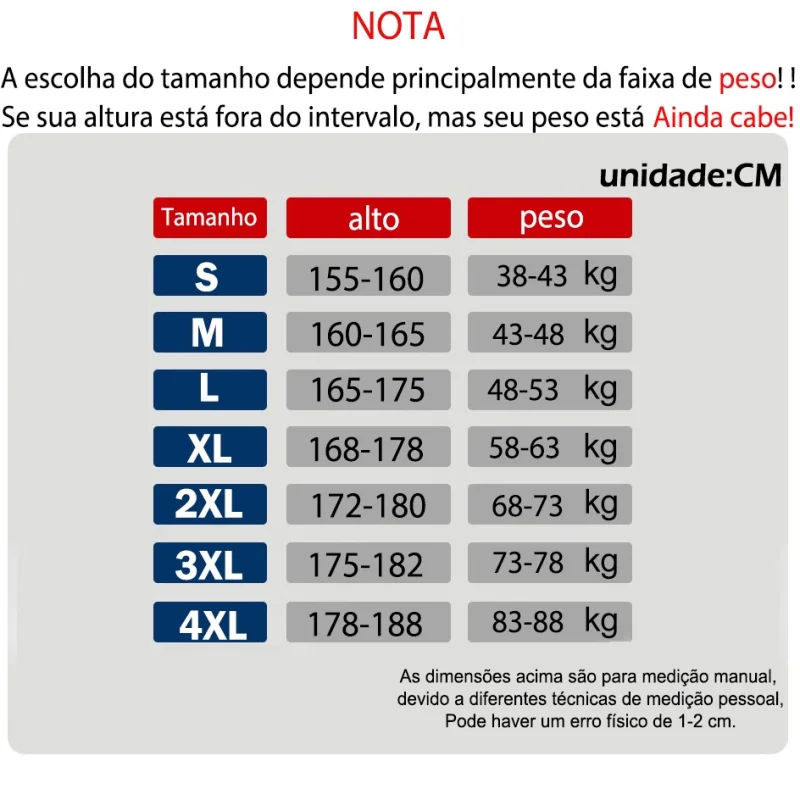 Vendemos tamanhos asiáticos Seu tamanho é de 12 cm menor que os EUA Reino Unido Austrália e Europa favor escolher o tamanho de acordo com nossa tabela de tamanhos Em caso de dúvidas por favor indicar seu peso kg e altura CM na hora de colocar o pedido Vamos ajudálo a confirmar o tamanho