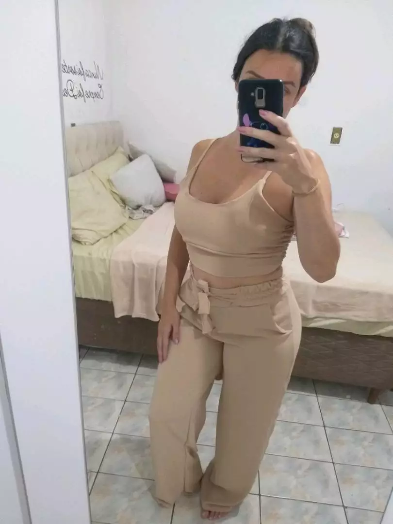 Conjunto no tecido de duna tecido leve e fluido corte alfaiataria corte modelador tecido de alta qualidade não amassa elástico na cintura e cropped com bojo e alça com regulagem