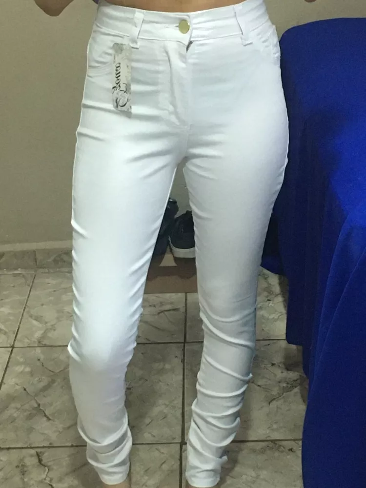 Compre a calça jeans feminina branca skinny de cintura alta com elastano na loja online Raryel. Aproveite nossos preços baixos e promoções!