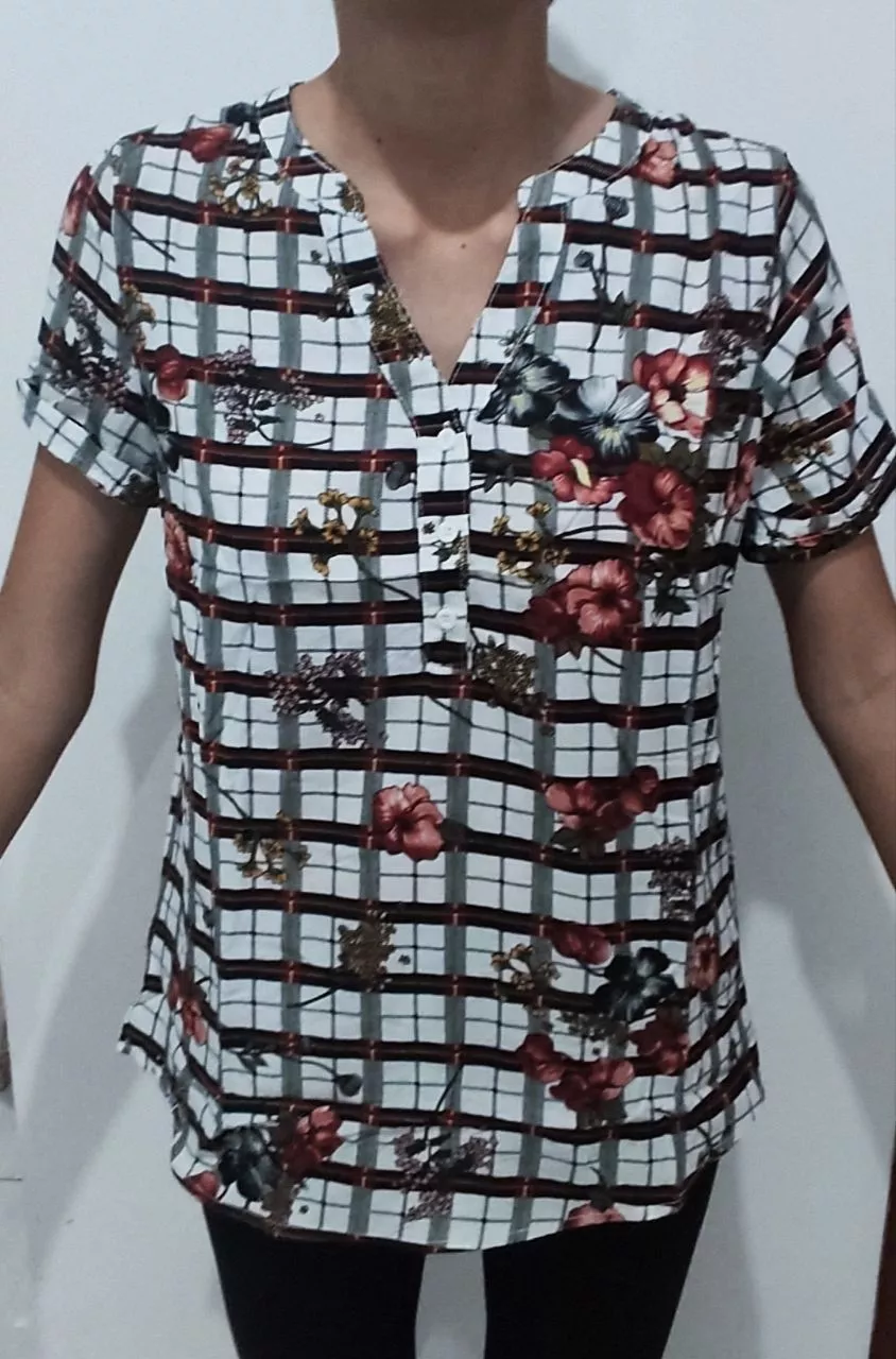 Compre a camisa feminina estampa xadrez floral manga curta decote V com 3 botões ZL3902 - 30 na loja online de roupas Raryel. Aproveite nossos preços baixos e promoções exclusivas!