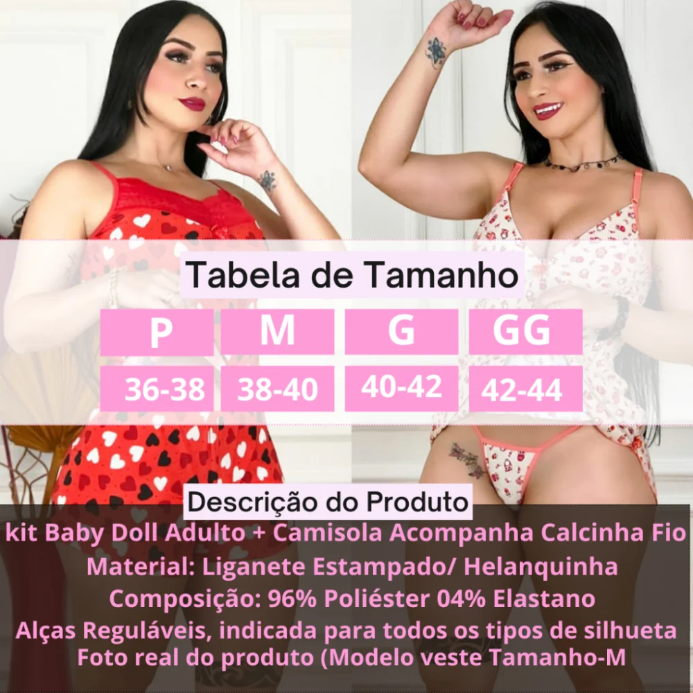 Os kits com Camisola e Baby Doll estampados não garantimos estampas devido a grande demanda e mudança de desenho nesse caso enviamos a mesma cor ou tonalidade das estampas parecida
