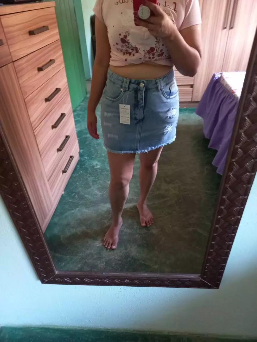 Compre a saia jeans cintura alta na loja online de roupas Raryel. Aproveite nossos preços baixos e promoções!