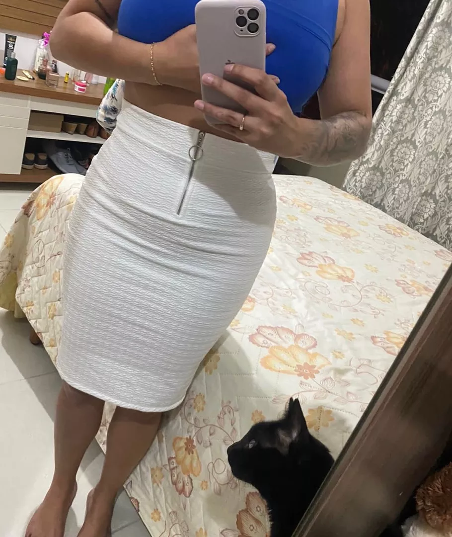 Saia do tipo lápis com pequeno ziper em metal com linda argola no pingente fabricada em tecido JACQUARD CREPE CIRRÊ tecido que confere excelente caimento e elasticidade não apresentando transparência Apenas a cor BRANCA tem forração