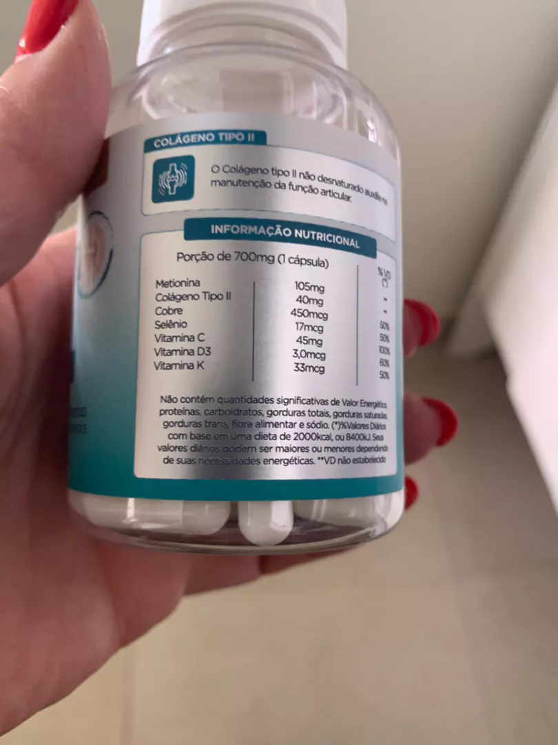 Ingredientes Metionina Colágeno Tipo II CT2 Vitamina C Ácido Ascórbico Cobre Sulfato de Cobre Anidro Vitamina K Fitomenadiona Selênio Selenito de Sódio Vitamina D Colecalciferol Antiumectantes Talco e Dióxido de Silício Ingredientes da cápsula gelatina e água potável filtrada NÃO CONTÉM GLÚTEN