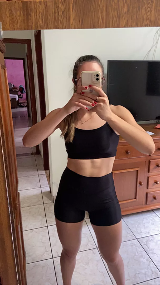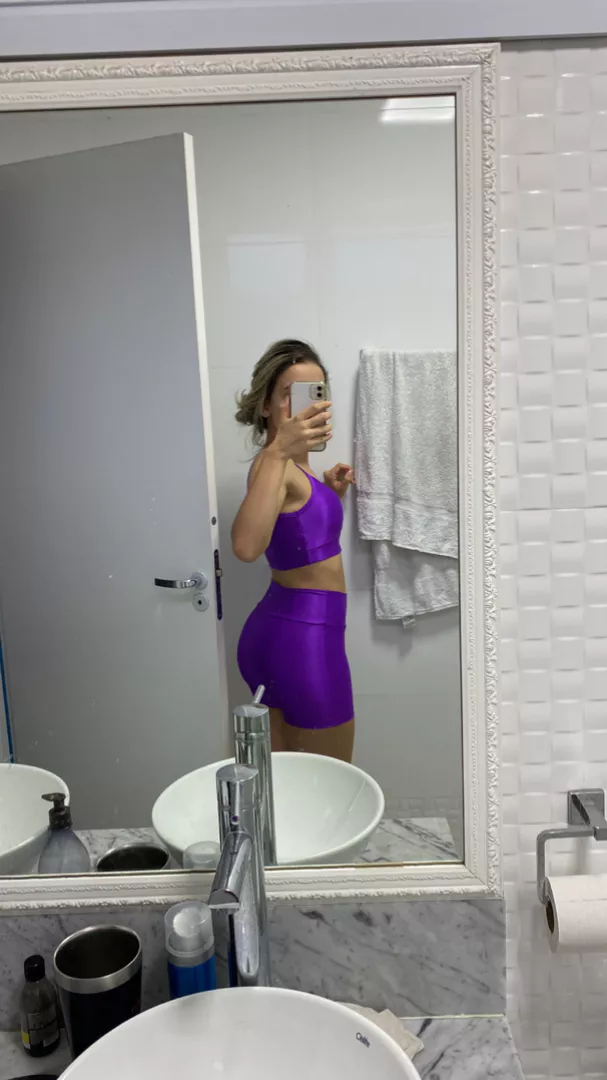 Compre o Conjunto Top + Shorts Canelado na Raryel, com bojo removível, costura reforçada e tecido de poliamida premium. Perfeito para academia, crossfit e possui um brilho incrível. Aproveite nossos preços baixos e promoções!