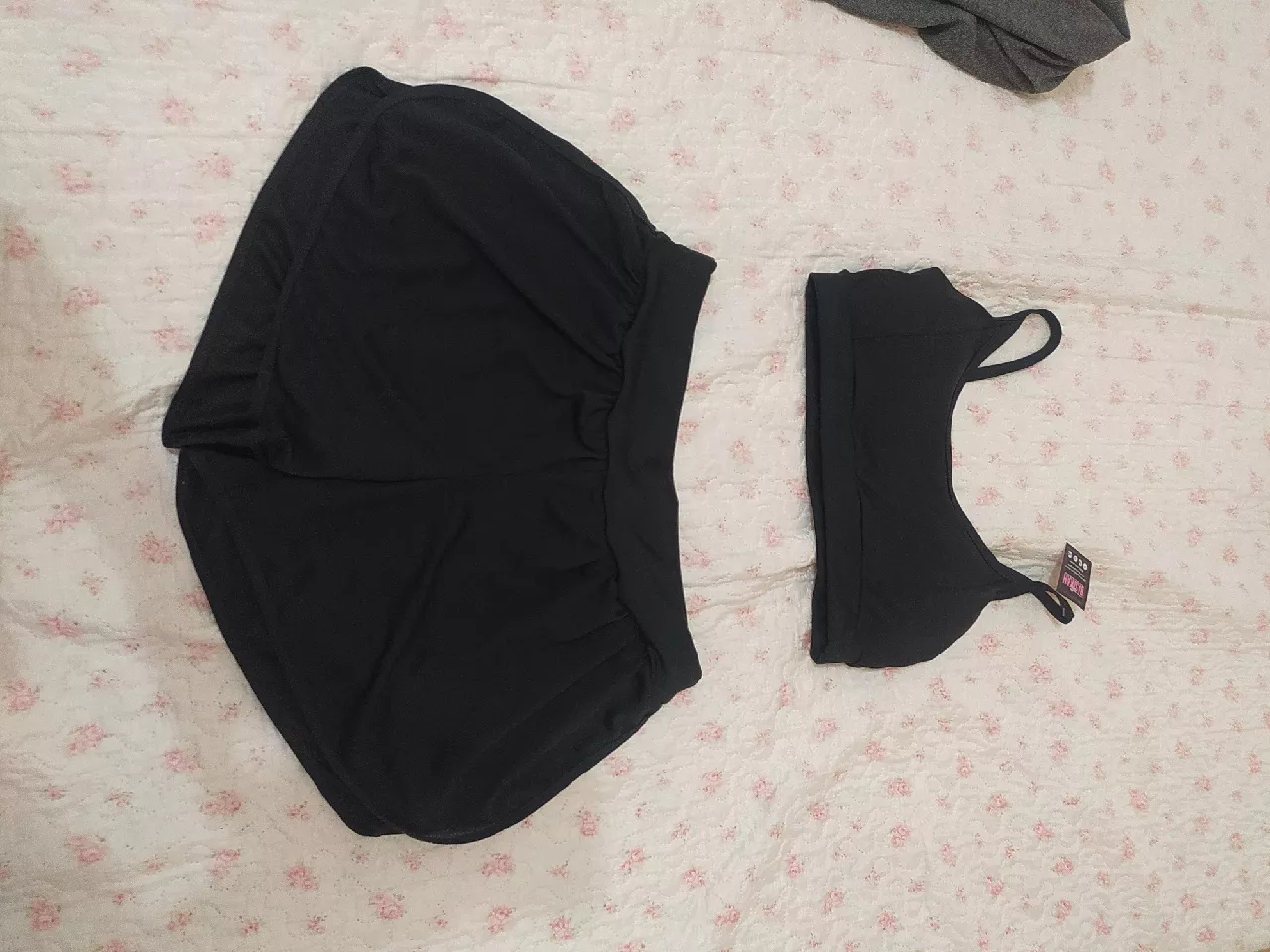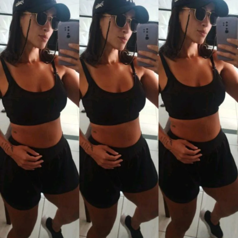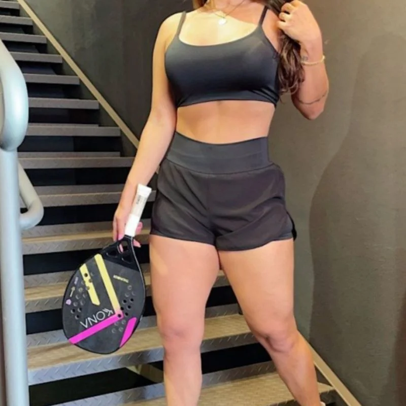 Short duplo sendo o de cima dryfit e debaixo poliéster com elastano apertadinho
