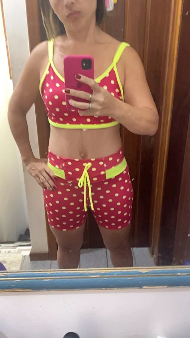 Conjunto short com cordinha e top com bojo para academia - Preto poa amarelo neon