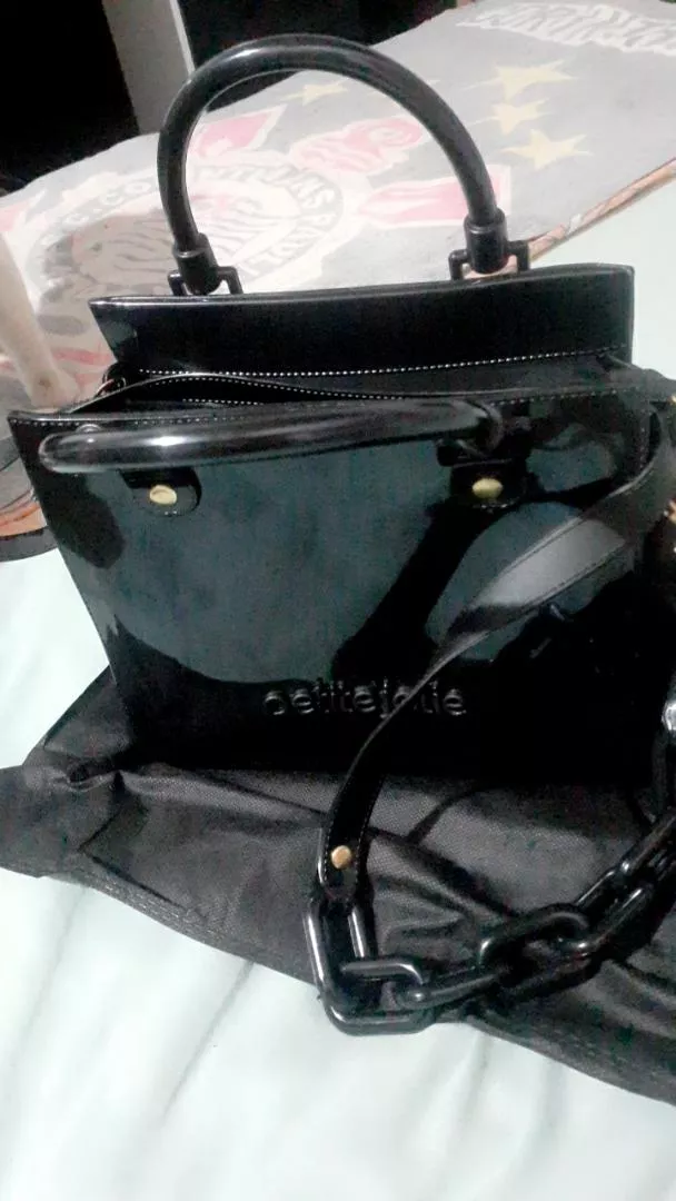 Bolsa estilo tote de tamanho médio Possui alça dupla pequena e uma alça transversal removível de corrente em PVC Fechamento em zíper e nome da marca em relevo na parte frontal
