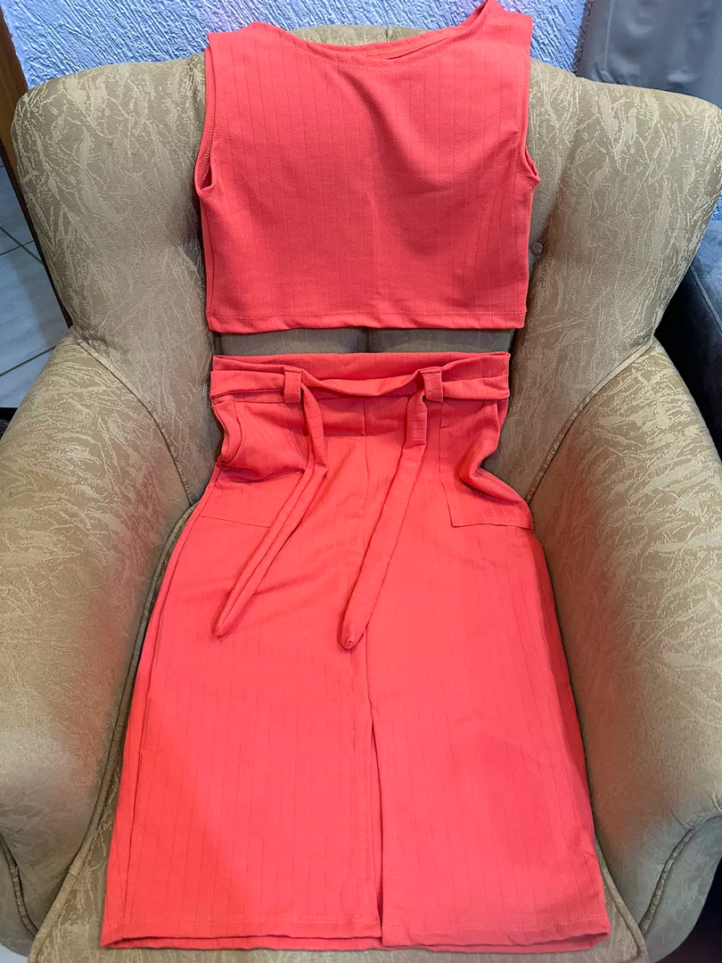 Compre o conjunto feminino cropped e saia midi com abertura na frente e amarração, disponível na loja online de roupas Raryel. Aproveite preços baixos, promoções e descontos exclusivos!