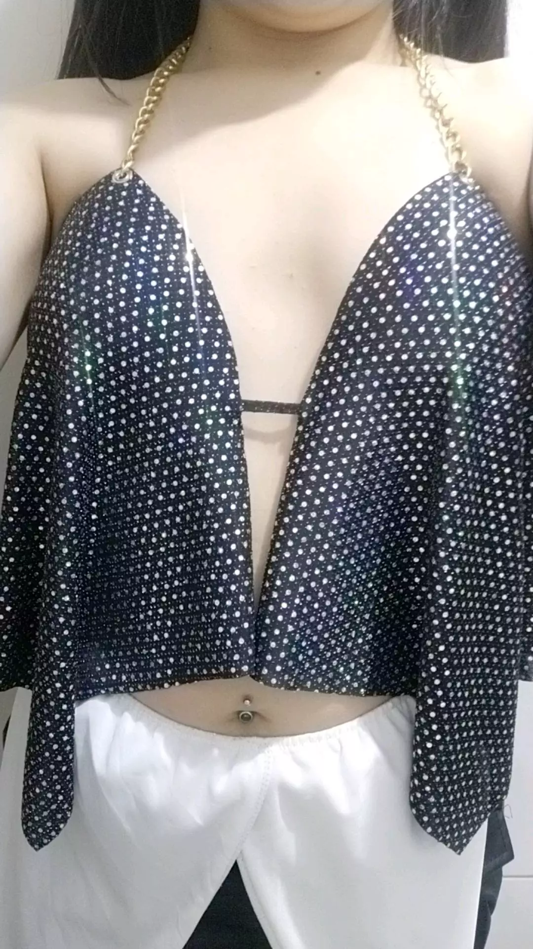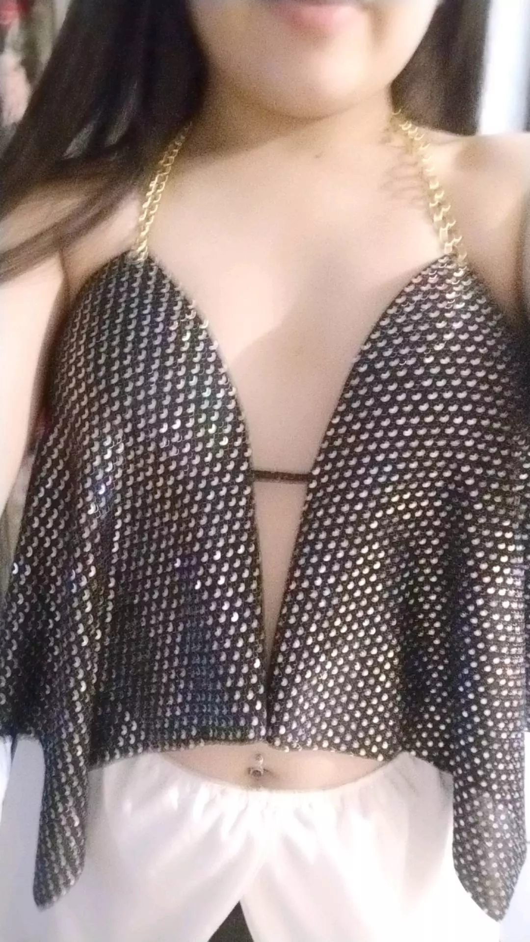 Cropped Feminino Lurex e Paetê Frente Única de Bico com Corrente