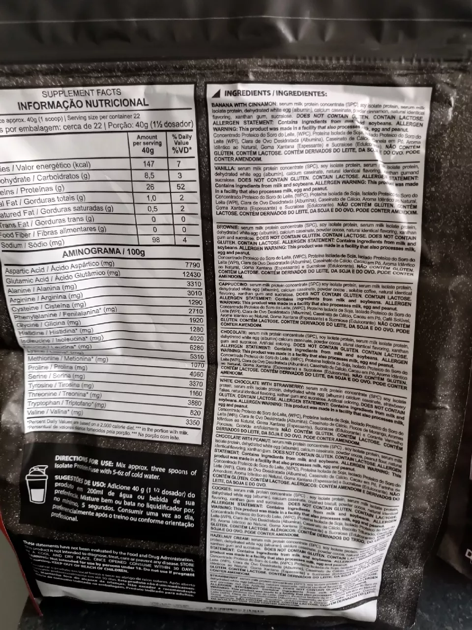 Concentrado proteico do soro do leite WPC proteína isolada de soja proteína hidrolisada do trigo glutamina peptídeo isolado proteico do soro do leite WPI clara de ovo desidratada albumina caseinato de cálcio aroma sintético idêntico ao natural de banana com canela sucralose edulcorante e corante artificial RT220 caramelo ALÉRGICOS CONTÉM DERIVADOS DO LEITE E DA SOJAIngrediente usado no processo de instantaneização da proteína do soro do leite