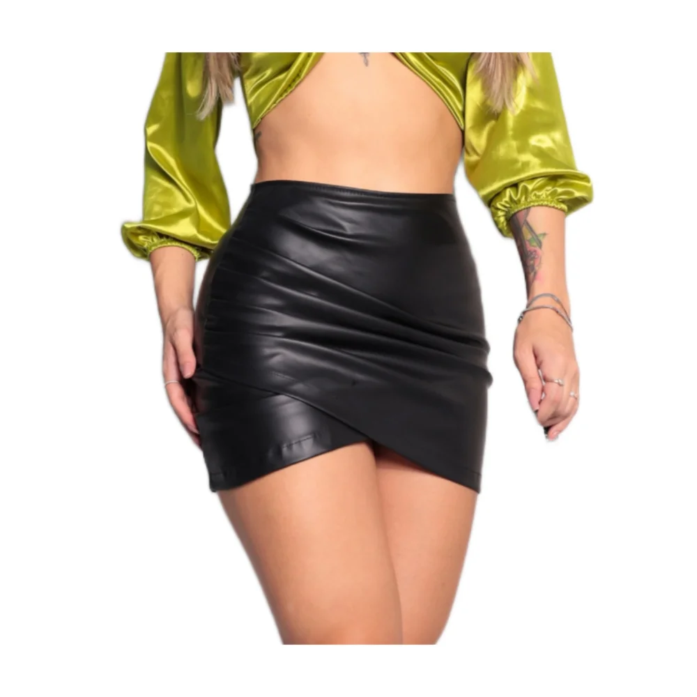 Drapeado frontal Saia Curta Couro Sintético - Preto