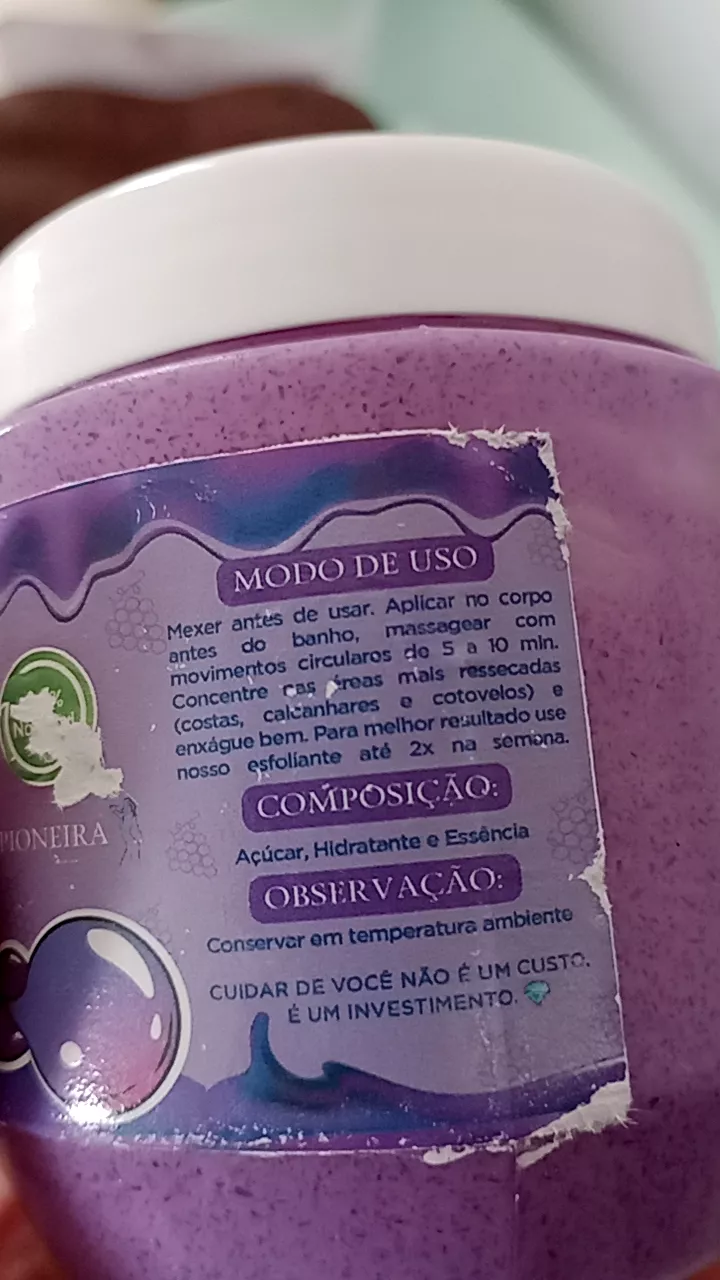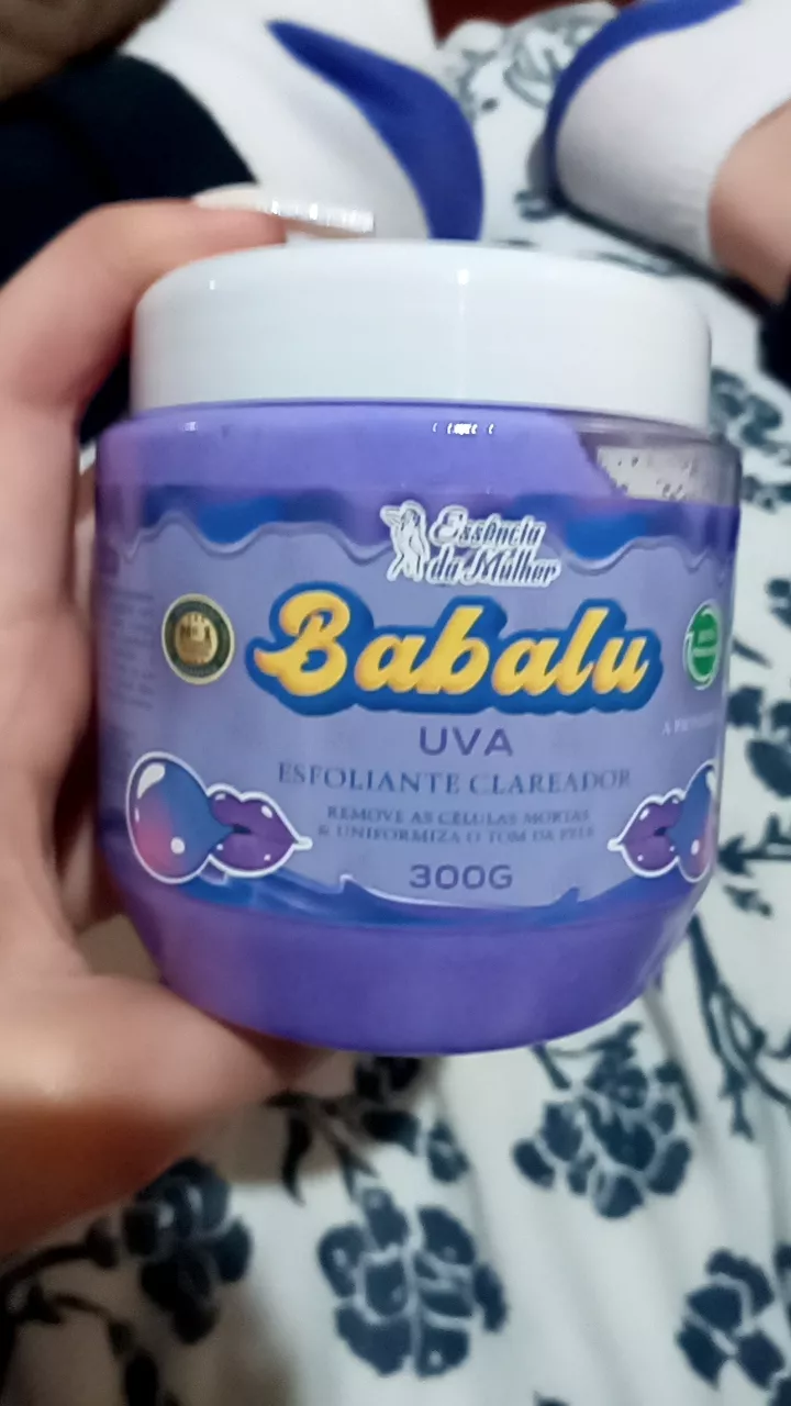 O Esfoliante corporal e facial ESSÊNCIA DA MULHER possui um delicioso cheirinho de chiclete Babalu de Uva limpa e remove as células mortas e impurezas que estão na superfície da pele promovendo um clareamento e uma sensação única além de manter o pH natural da pele