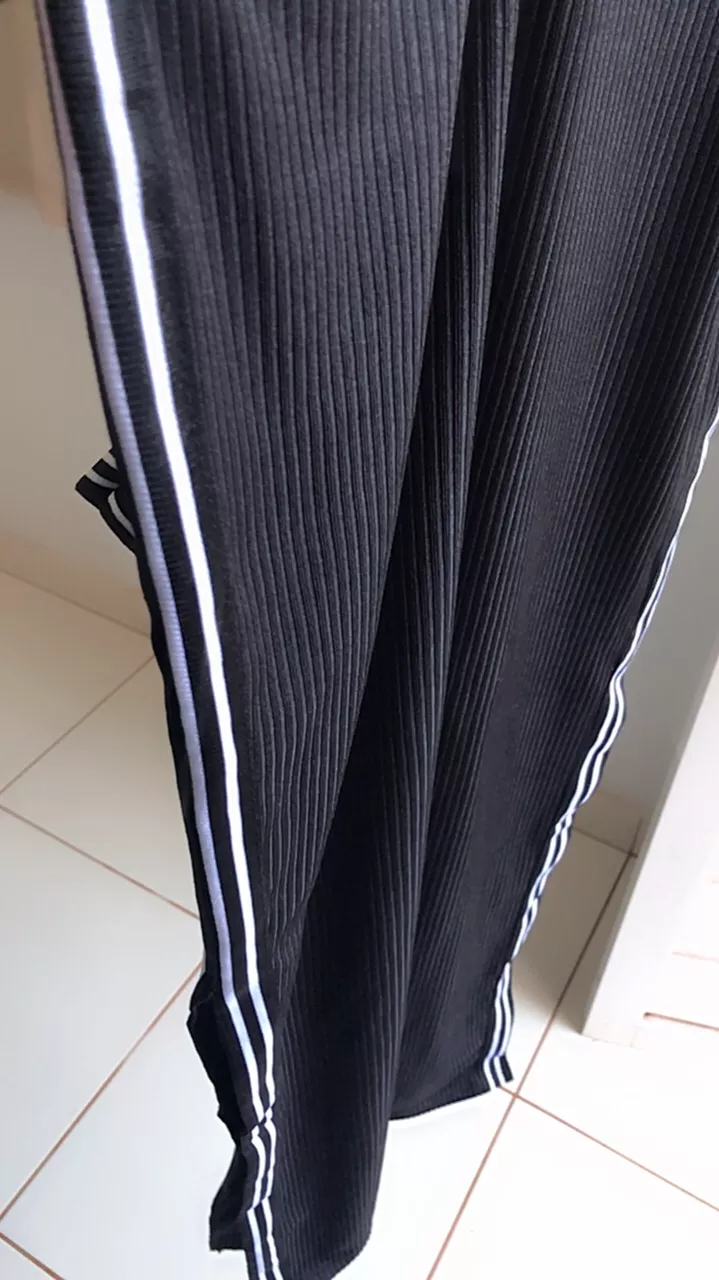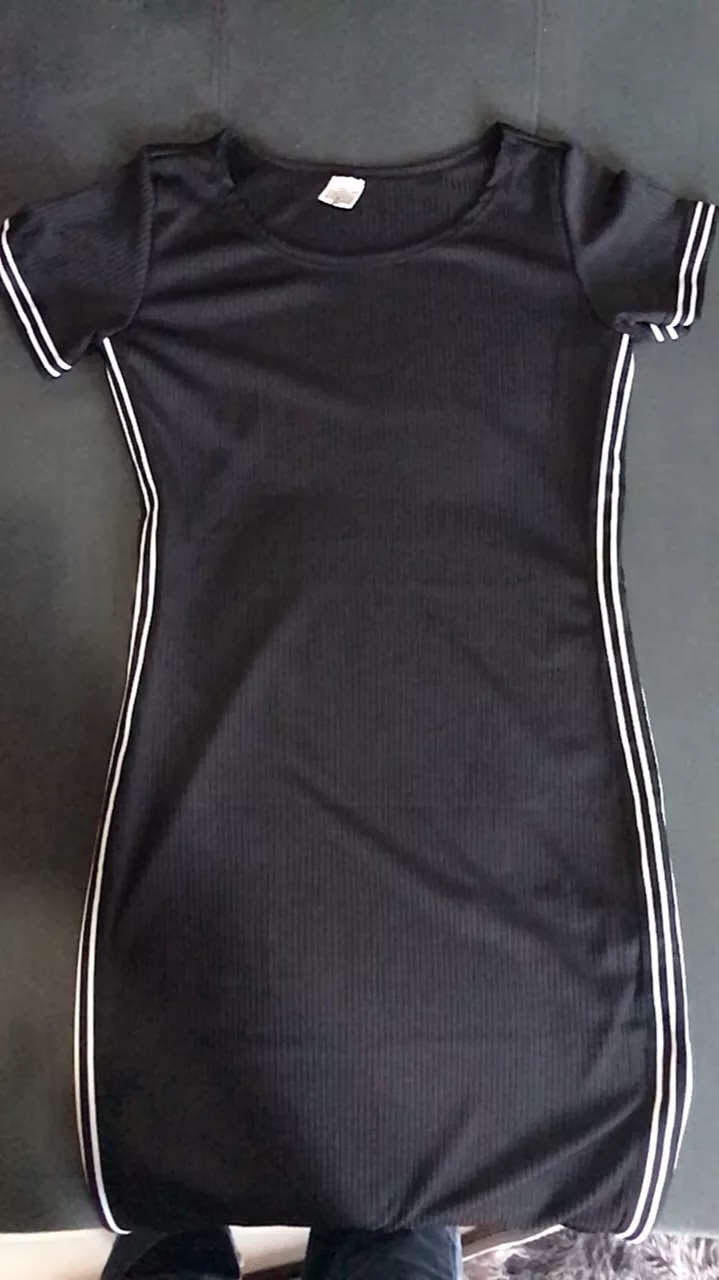 Modelo tubinho com fenda nas laterais com bojo faixa na lateral e barra da manga manga curta e gola redonda