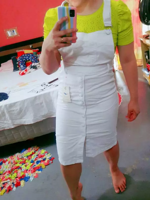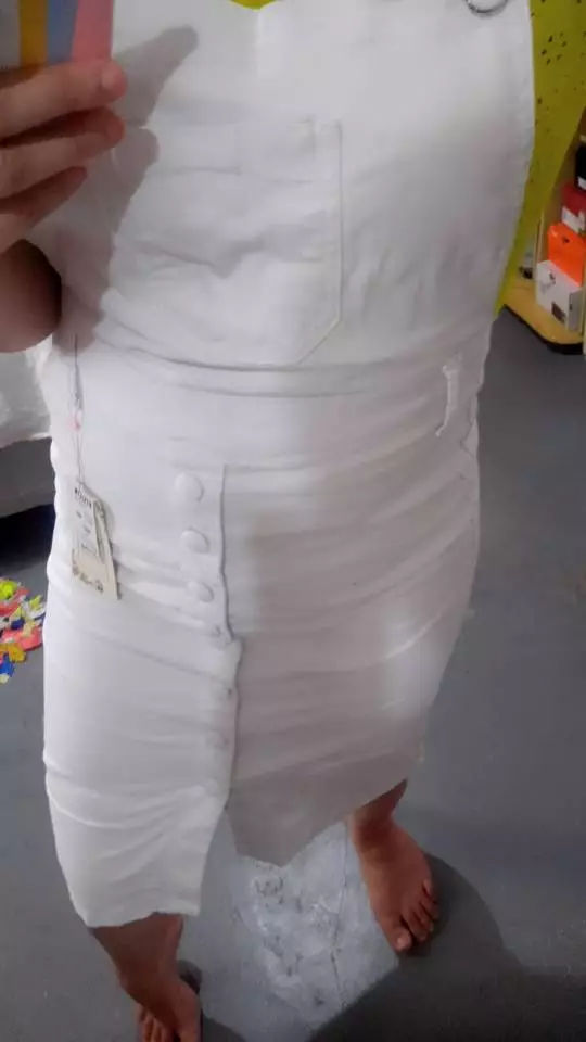 Jardineira branca midi em jeans para moda evangélica - Jardineira branca botões