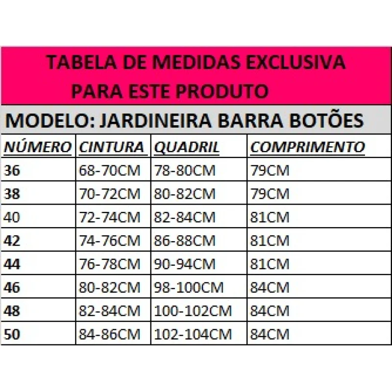 A SALOPETE CONTÉM DETALHES EM BOTÕES NA BARRA POSSUI UM BOLSO FRONTAL E TRASEIROS CONTÉM ALÇA REGULÁVEL COM O COMPRIMENTO NA ALTURA DO JOELHO