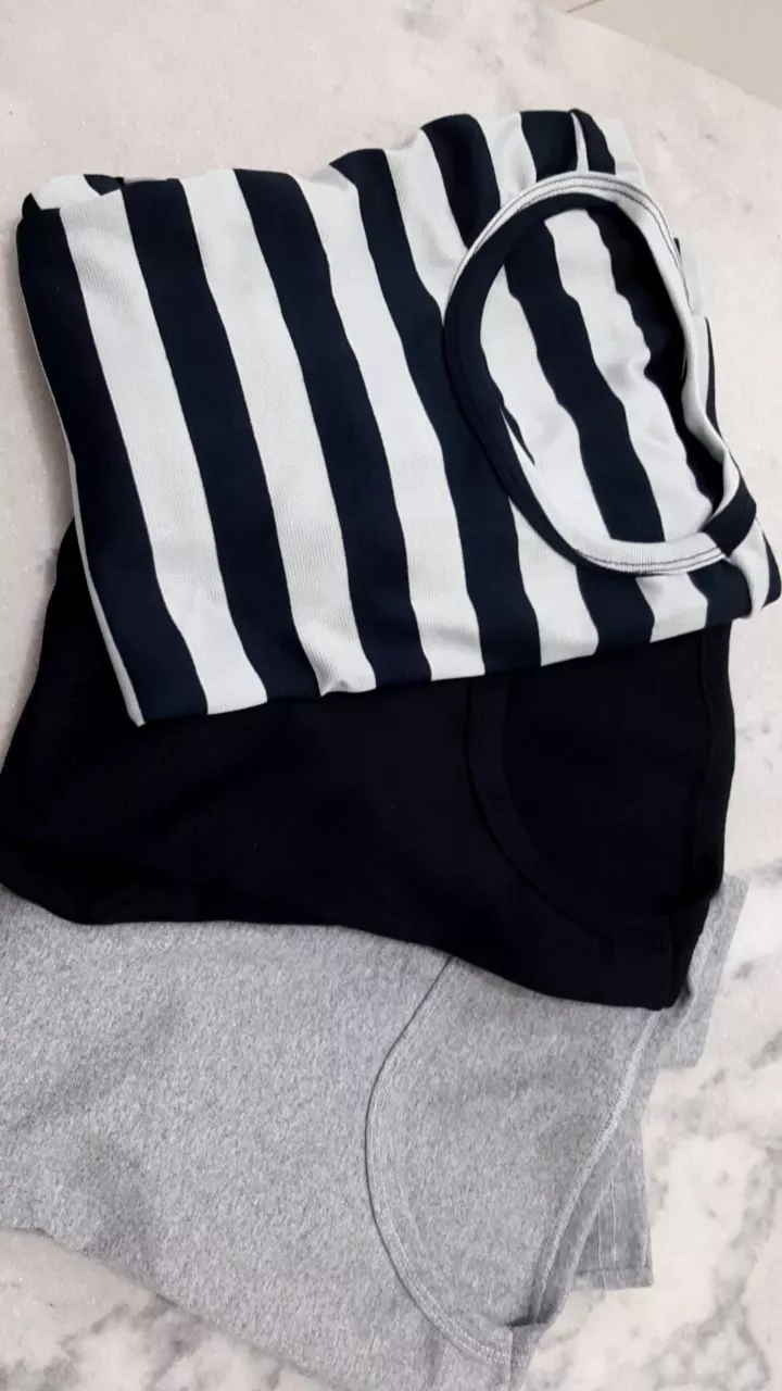 LEMBRANDO QUE NESSE KIT VAI UMA PEÇA DE CADA COR SENDO ELAS PRETA MESCLA E LISTRADA PRETO COM BRANCO