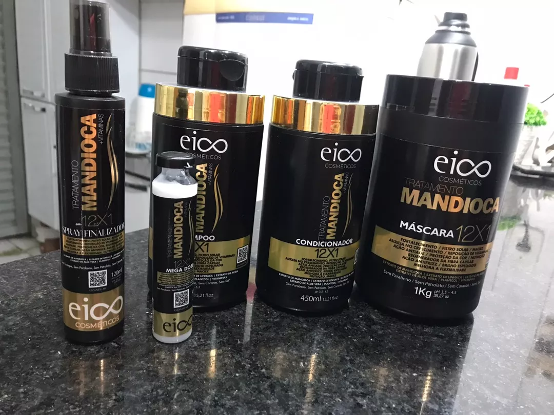 Compre o Kit Eico Mandioca com Shampoo, Condicionador, Máscara Hidratação, Spray Leave-in e Ampola Crescimento Capilar na loja online de roupas Raryel. Tenha cabelos hidratados, fortalecidos e com crescimento acelerado. Aproveite os preços baixos e promoções!