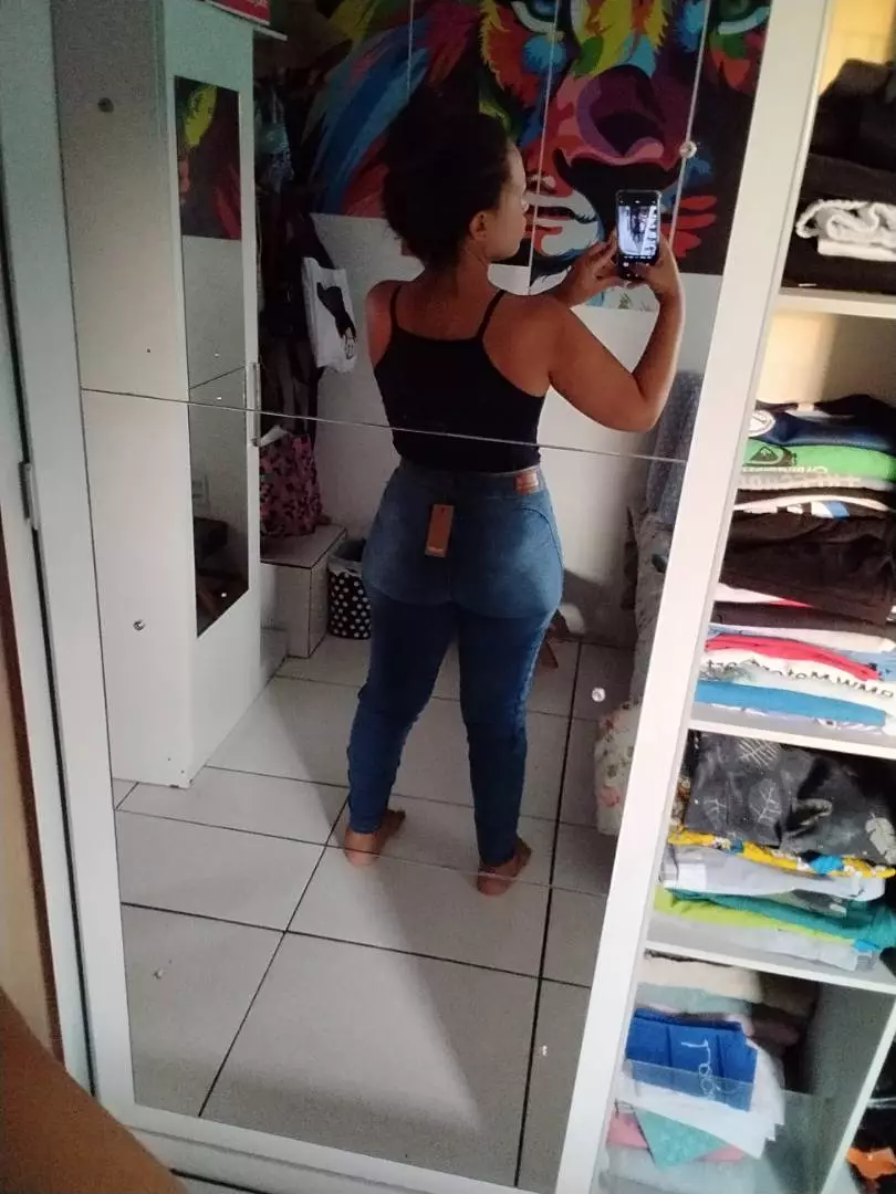 calça jeans feminina lavagem escura super elastano cintura alta e sem bolsos traseiros efeito empina bumbum
