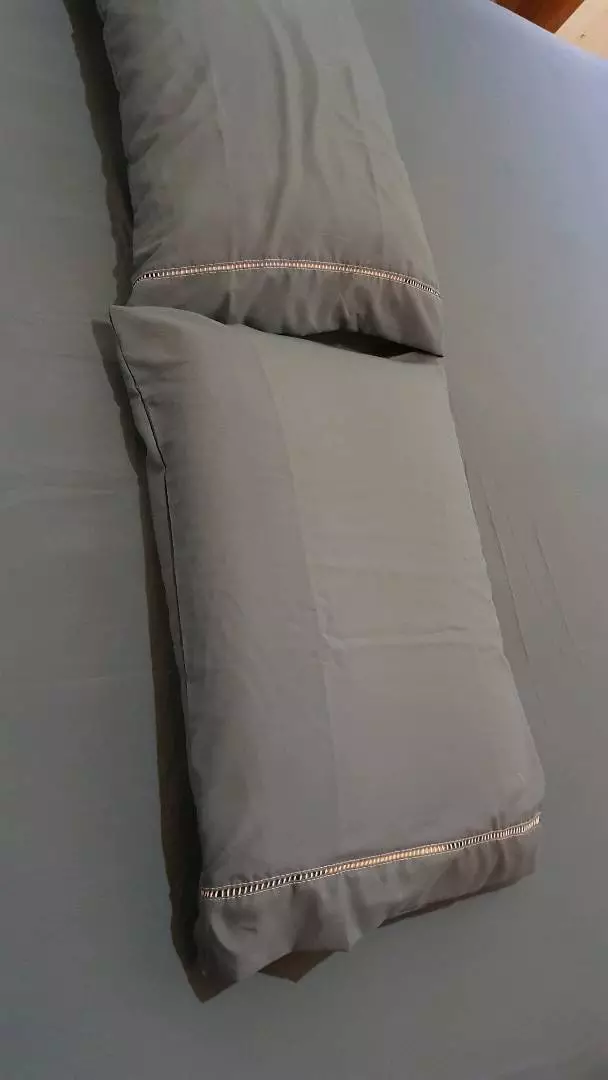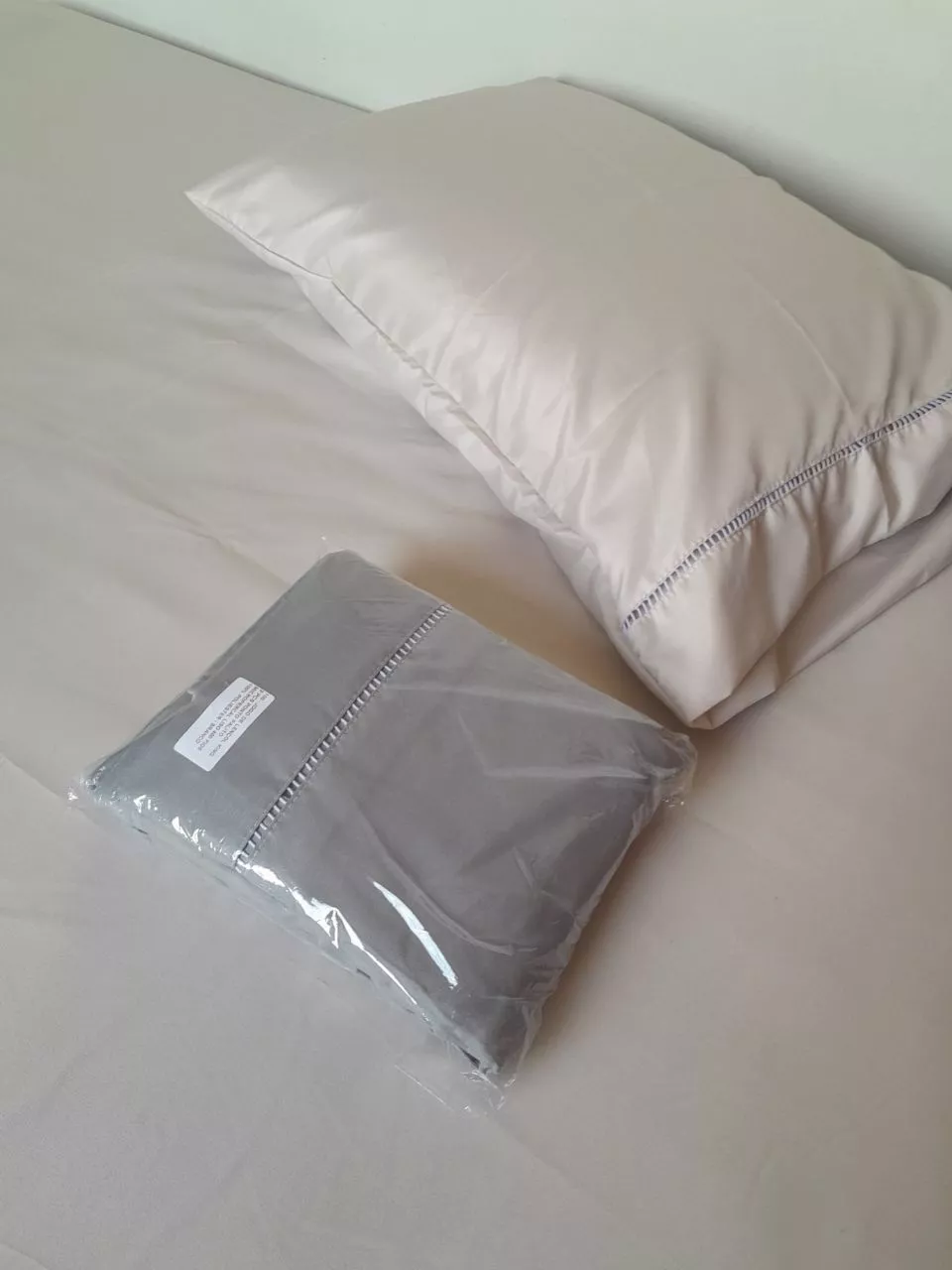 O lençol possui elástico em toda volta e as fronhas um lindo acabamento em PONTO PALITO