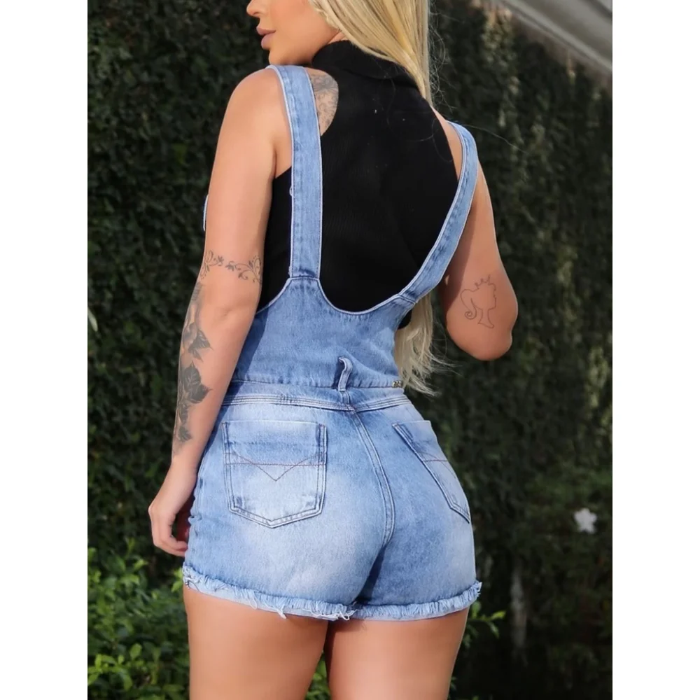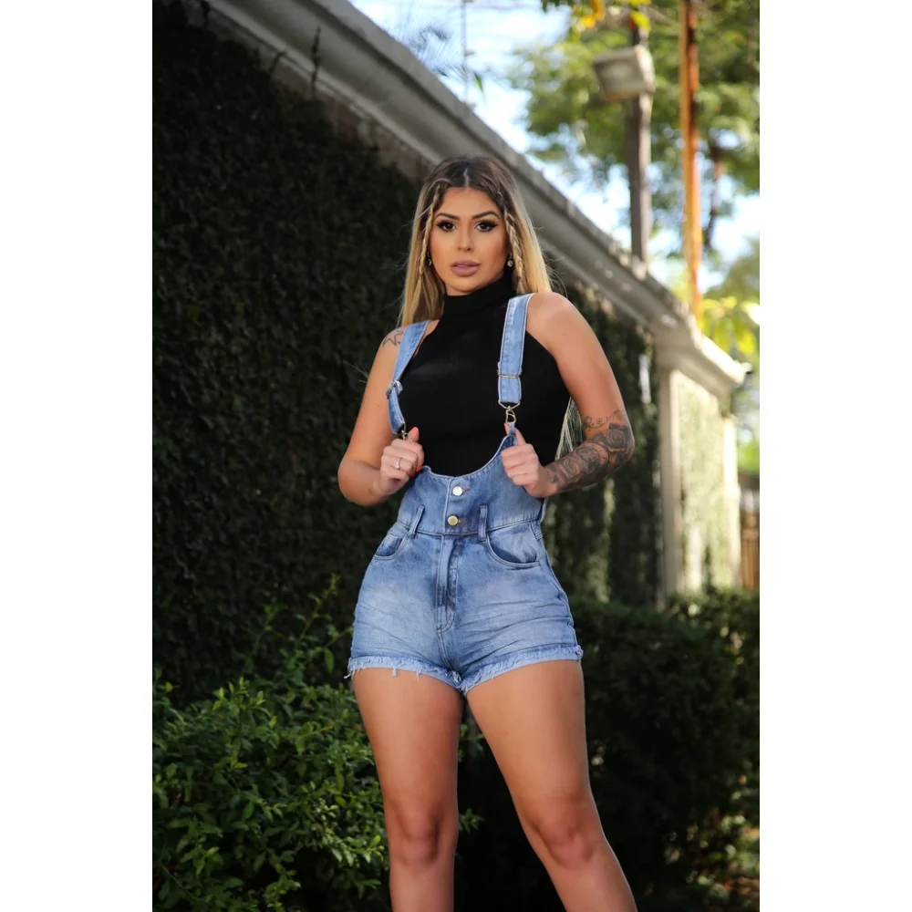 Macaquinho Jeans Meitrix - Jardineira Curta - Azul Claro