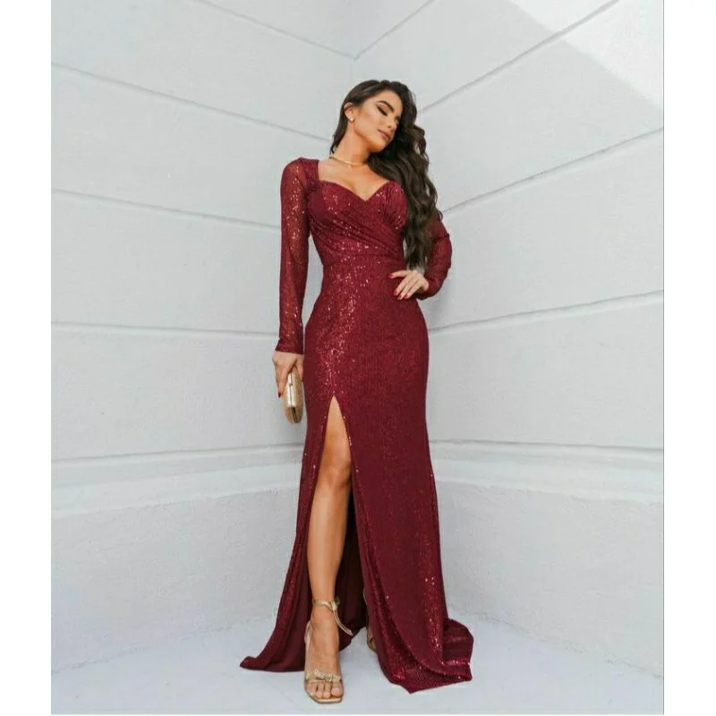 Madrinhas Festas Manga Longa Vestido Feminino Paetê Longo - Bordô