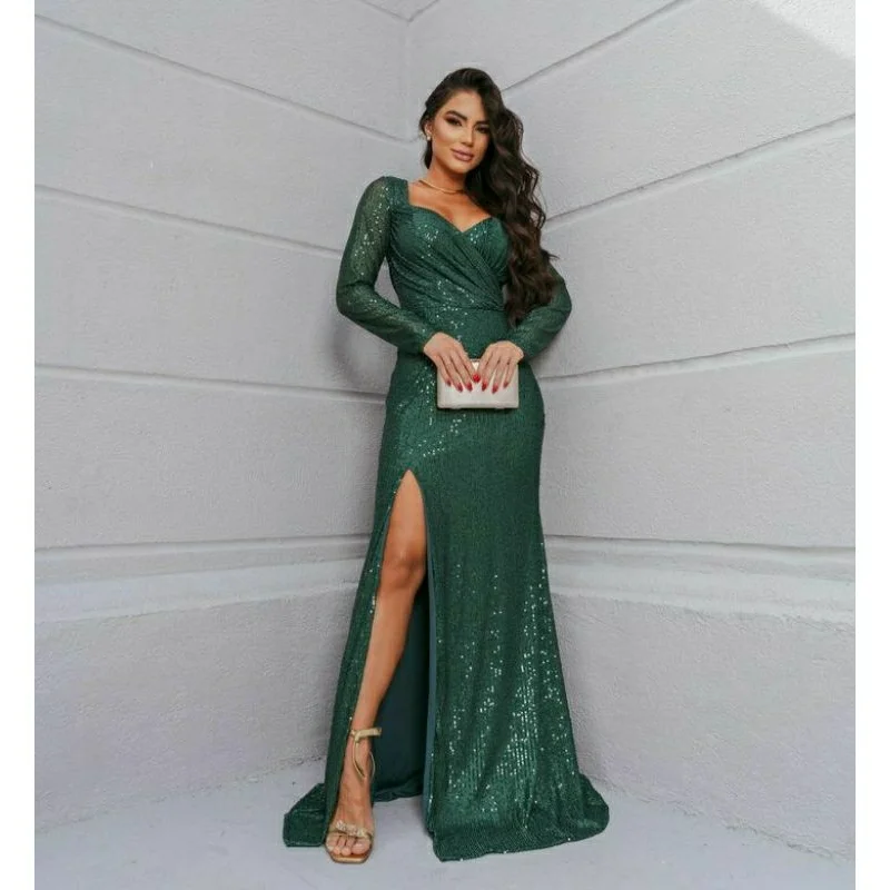 Vestido Feminino Longo Paetê Manga Longa Festas Madrinhas
