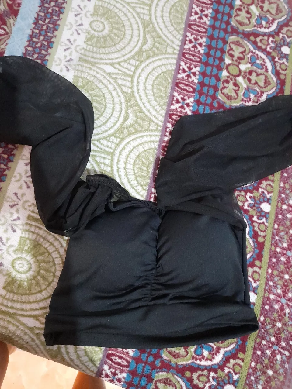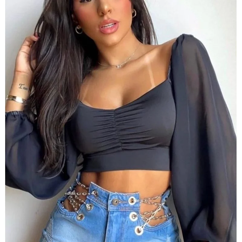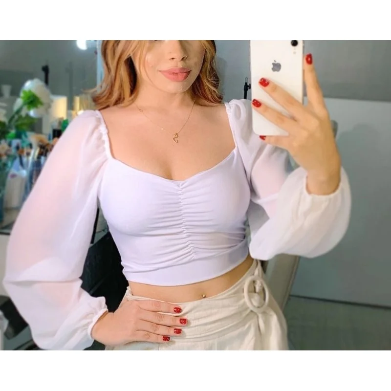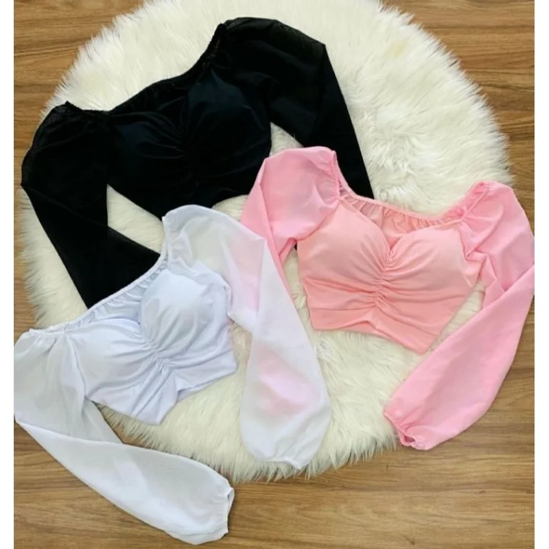 Compre o Cropped Top Suplex Tule Preto Branco Manga Longa Bufante Julliete na loja online de roupas Raryel. Aproveite nossos preços baixos e descontos!