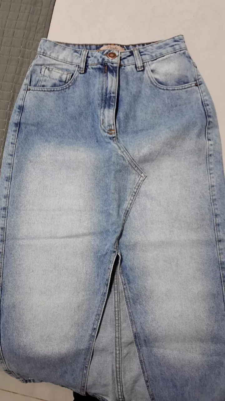 TAGS Saia jeans feminina modelo midi Saia jeans longa com recorte frontal Saia jeans feminina levanta bumbum Saia jeans cintura alta Saia jeans feminina lavagem clara Saia jeans de algodão macio e encorpado Saia midi feminina versátil Saia jeans feminina elegante Saia jeans feminina com detalhes na barra Saia jeans feminina estilo moderno