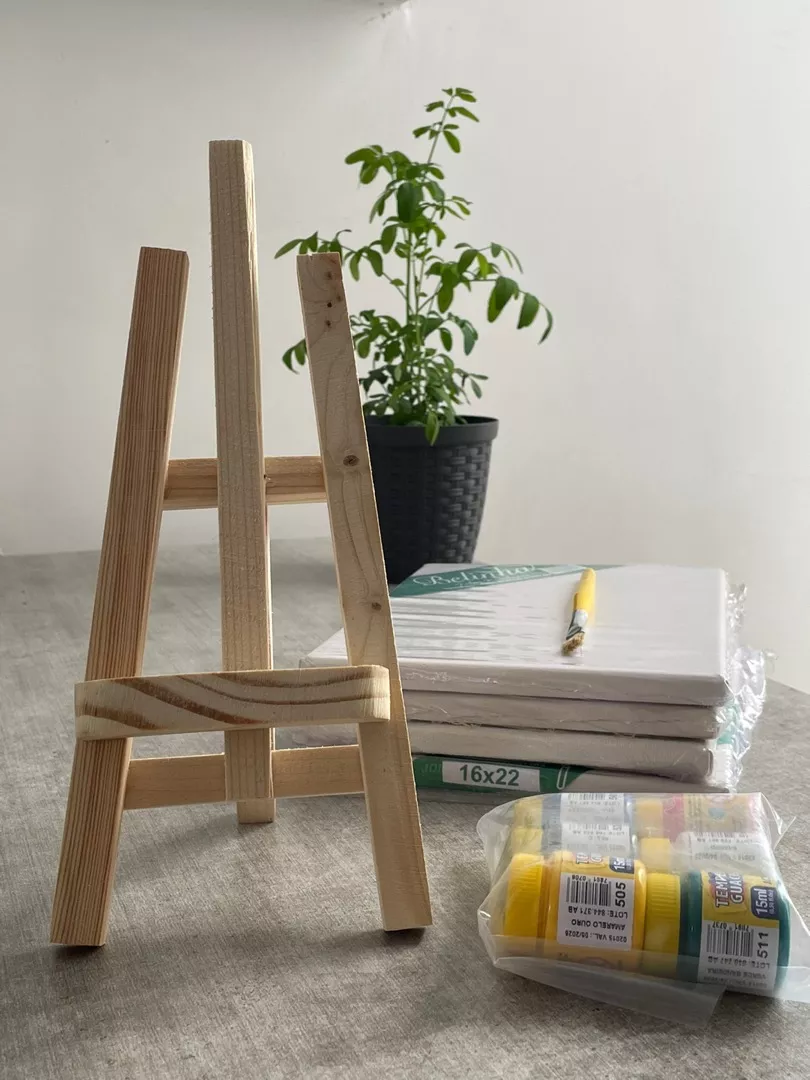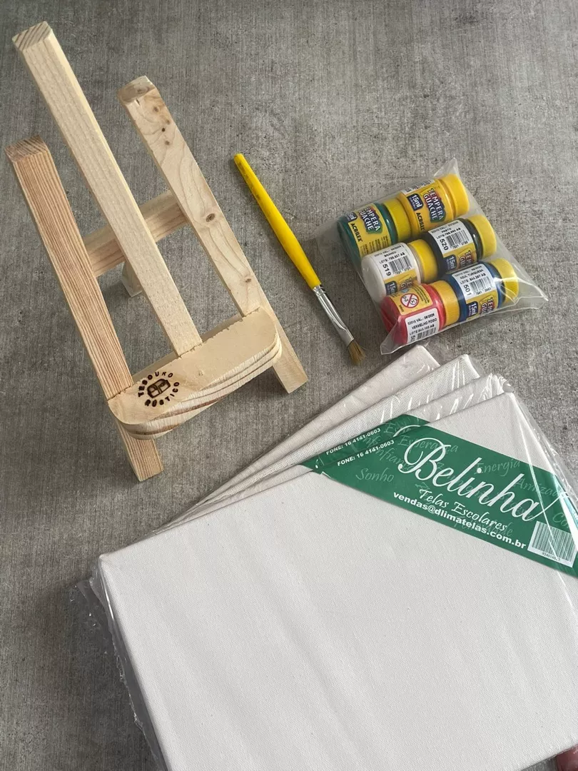 Mini Cavalete + Kit Pintura 4Telas: 16X22, 6 Tintas e Pincel - Único