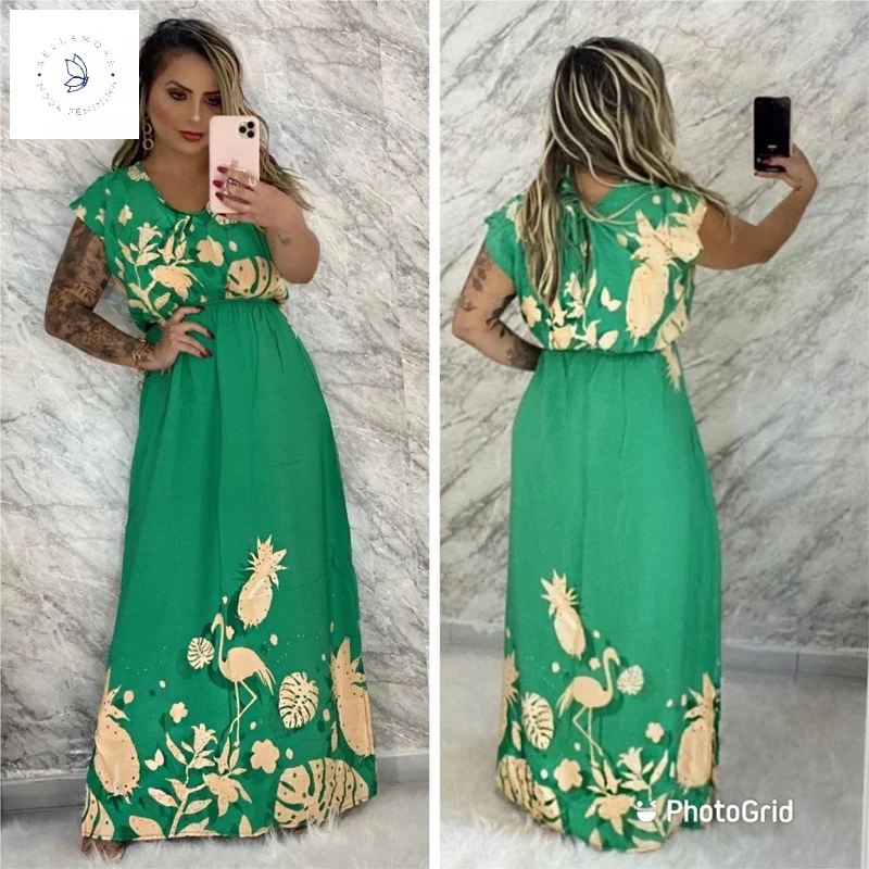 Compre o Vestido Longo Feminino Estampado Manga Curta na loja online de roupas Raryel. Feito em viscose, possui fenda lateral e é perfeito para mulheres evangélicas que buscam estilo e conforto. Aproveite nossos preços baixos e promoções!